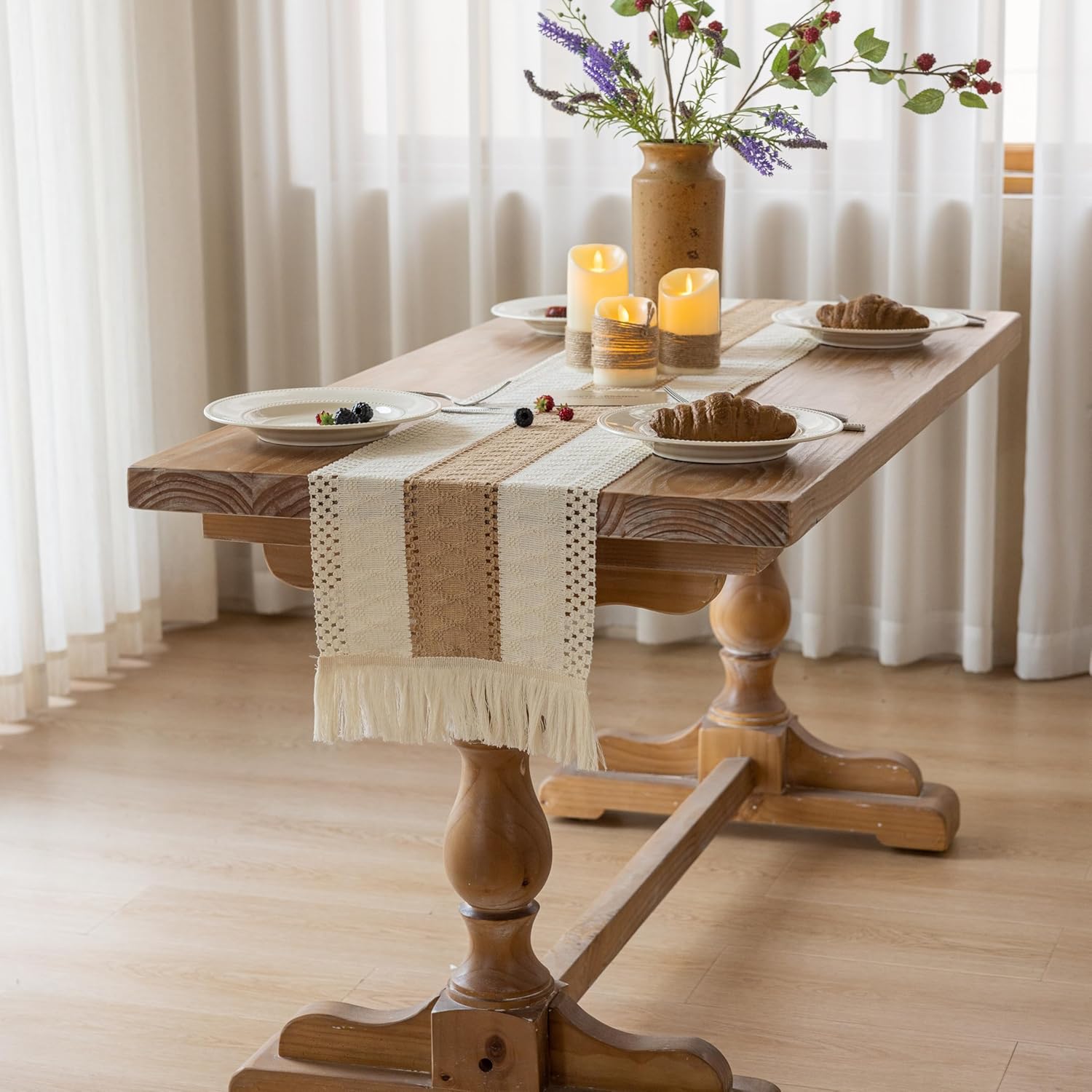 Keketo Boho Table Runner Cream Beige Brown for Home Decor 12x72 Inches Farmhouse Macrame Burlap Jute Rustic Dining Kitchen Centerpiece Bohemian Decor French Country Bridal Shower Decorations