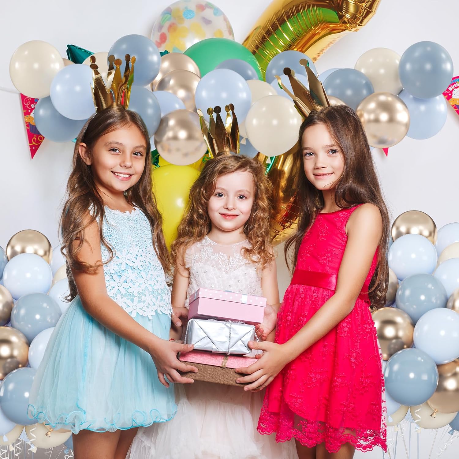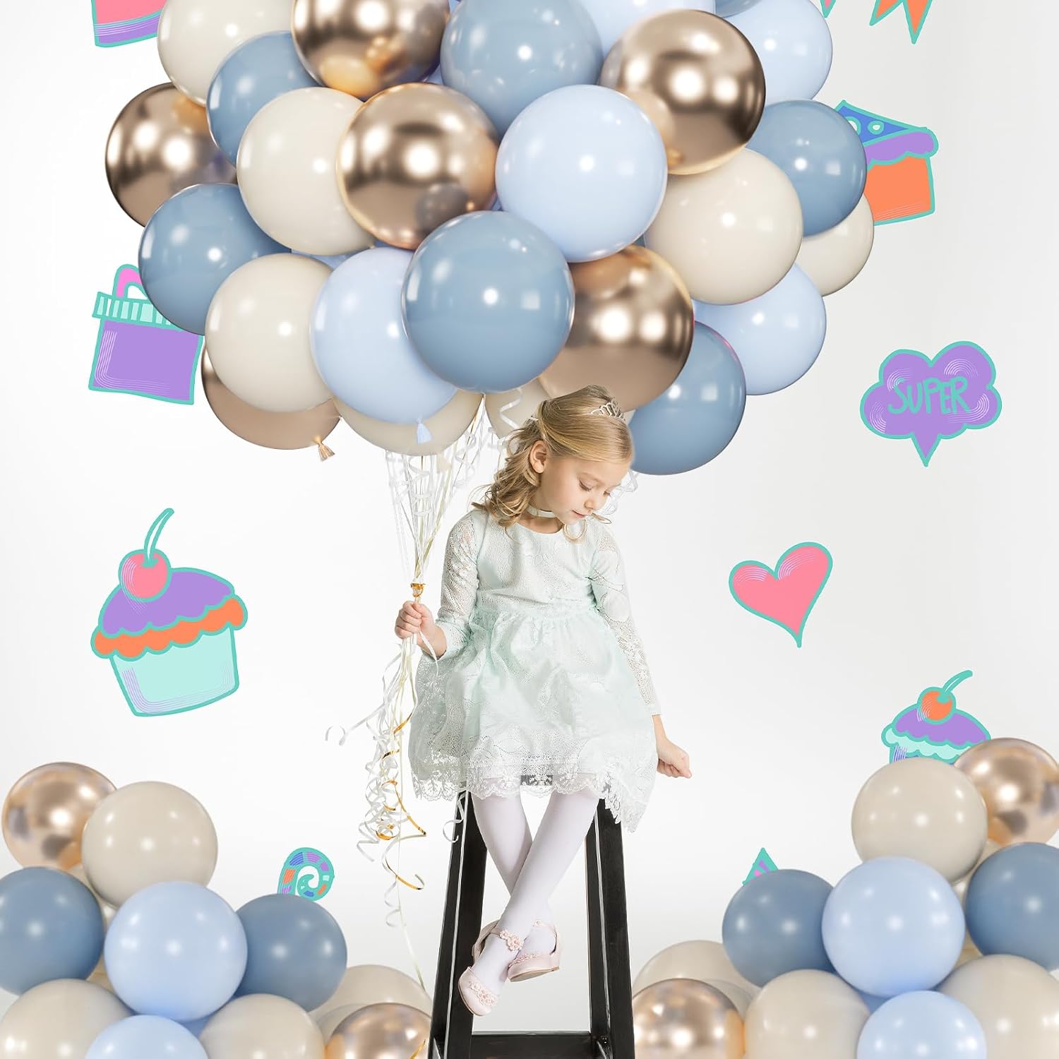 - Curated Twilight Color Palette : 100 premium 12β dusty blue and gold balloons kit (30 retro dusty blue balloons, 25 fog pastel blue balloons, 25 sand white balloons, 20 metallic champagne gold balloons) + 2x 33ft ribbons. Create ethereal boho arches or photo walls!