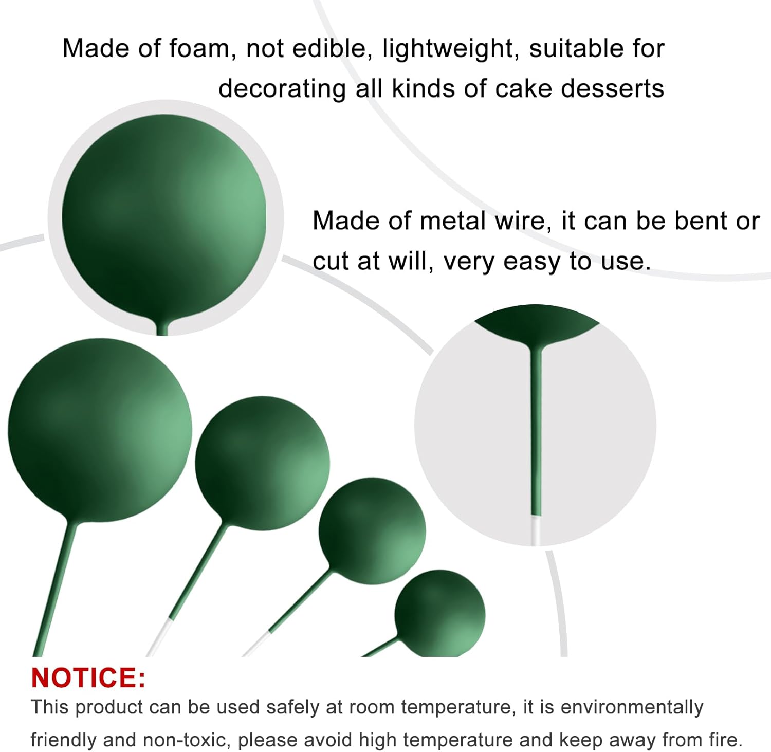 - Premium Material: These cake topper balls are made of foam and wire. Safe to decorate food at room temperature, such as cake or dessert decorating use, or cupcakes, fruits, cheese and any dish and appetizer you want to decorate.