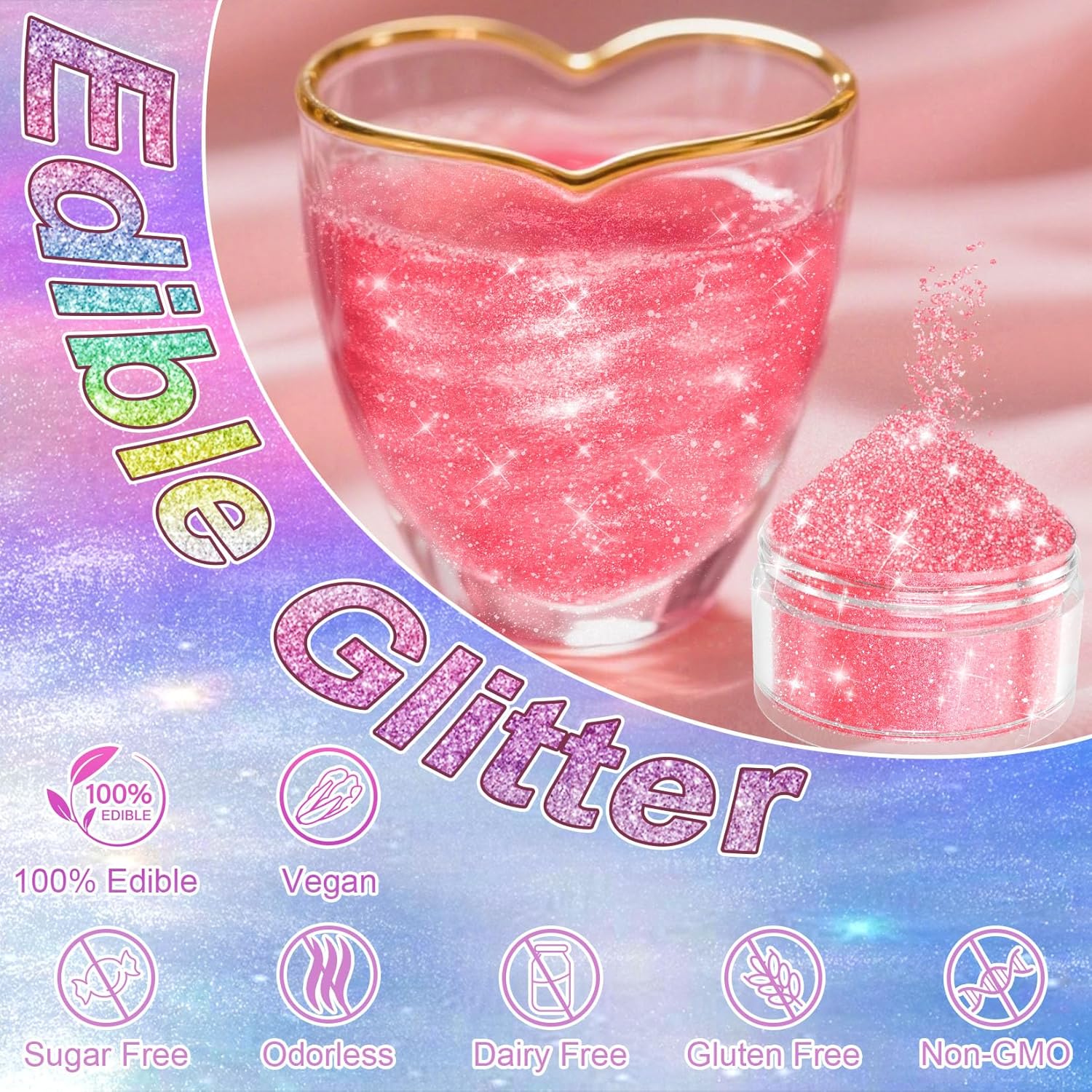 - Versatile Usage for Various Treats: Our edible glitter for drinks is perfect for enhancing drinks, cocktails, cakes, cupcakes, candies, chocolates, and gummies. Add a touch of vibrant color and shimmering effects to your DIY decorations, turning ordinary treats into extraordinary delights with the edible glitter for cakes.