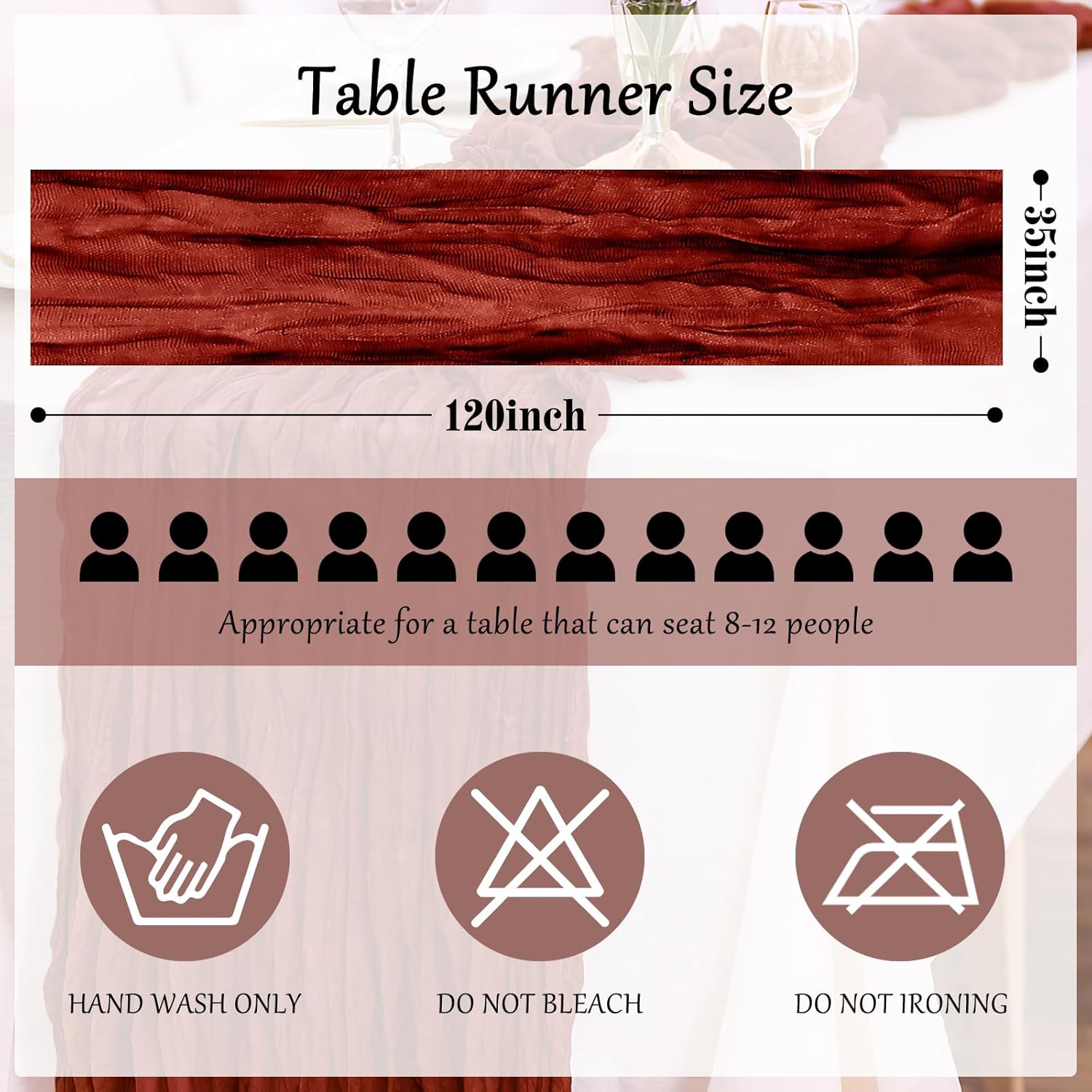 - đ ăGenerous Size & Variety ColorsăEach cheesecloth table runner measures 35" x 120" (10FT), fitting long banquet tables, round tables, or even spliced for extra length. The 6-pack cheesecloth runner offers unbeatable value for large events or frequent decor changes. In addition, our cheese cloth table cloths come in a variety of colors to choose from and are abundant in quantity. Dusty pink and sage green table runner are the most popular colors