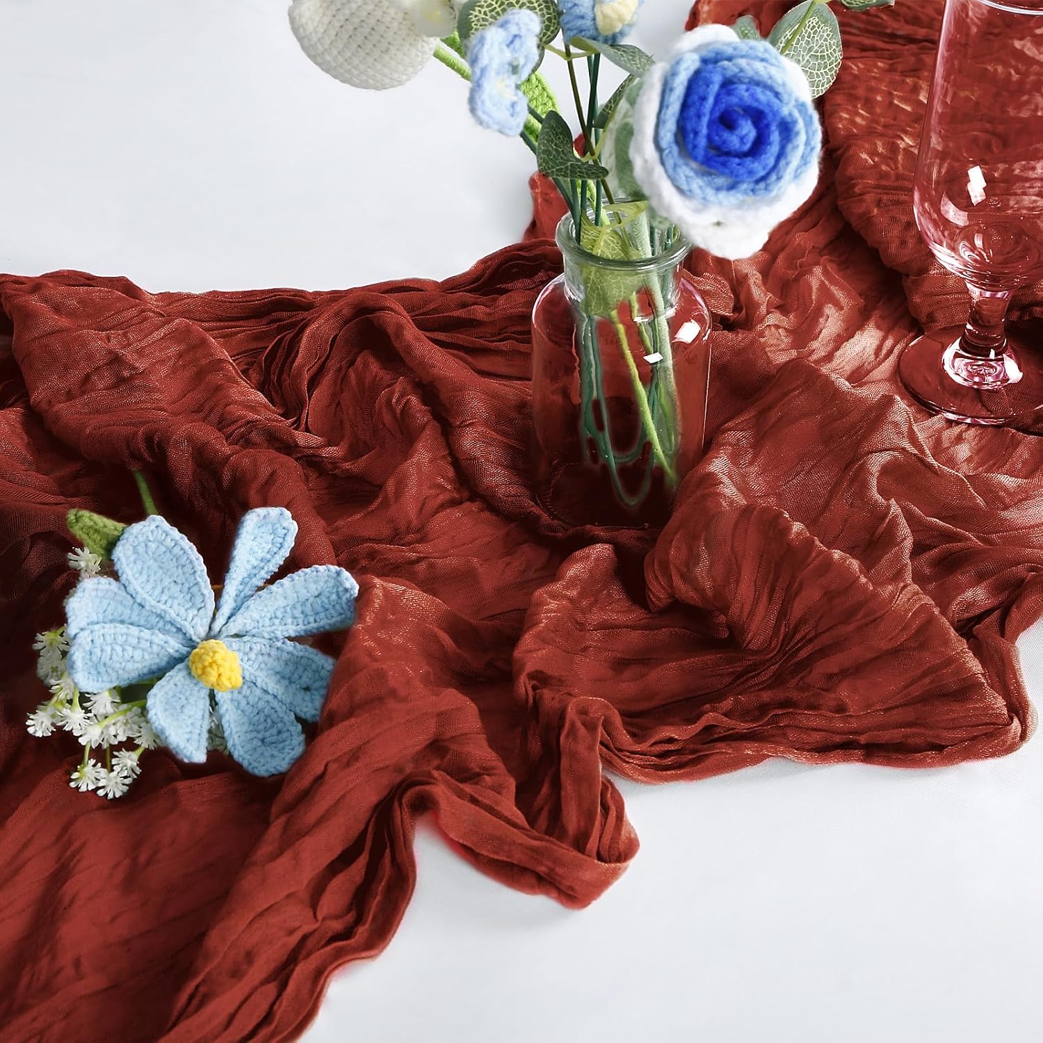 - đ ăPremium & Breathable Materială Crafted from high-quality polyester gauze, our table runners are ultra-soft, lightweight, and skin-friendly with delicate frayed edges for a rustic charm. The dusty pink hue cheese cloth table runner adds a romantic touch, while the crinkled texture cheesecloth ensures elegant draping for any table setting.