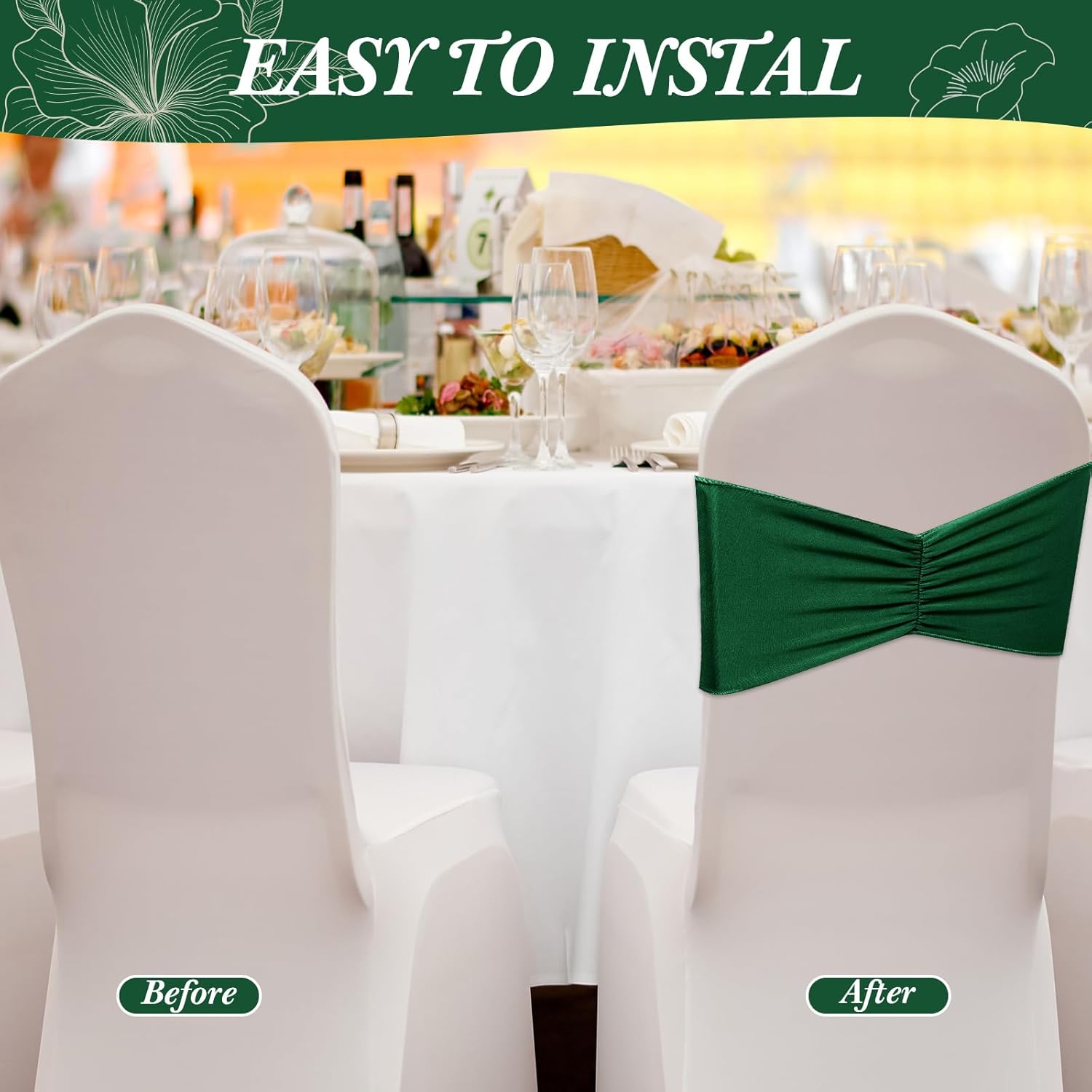 Moukeren 100 Pcs Spandex Chair Sashes Bows Bands Slider Sashes for Chair Covers Elastic Bands Ties Ribbon Decorations for Wedding Party Events Ceremony Birthday Banquet (Dark Green)