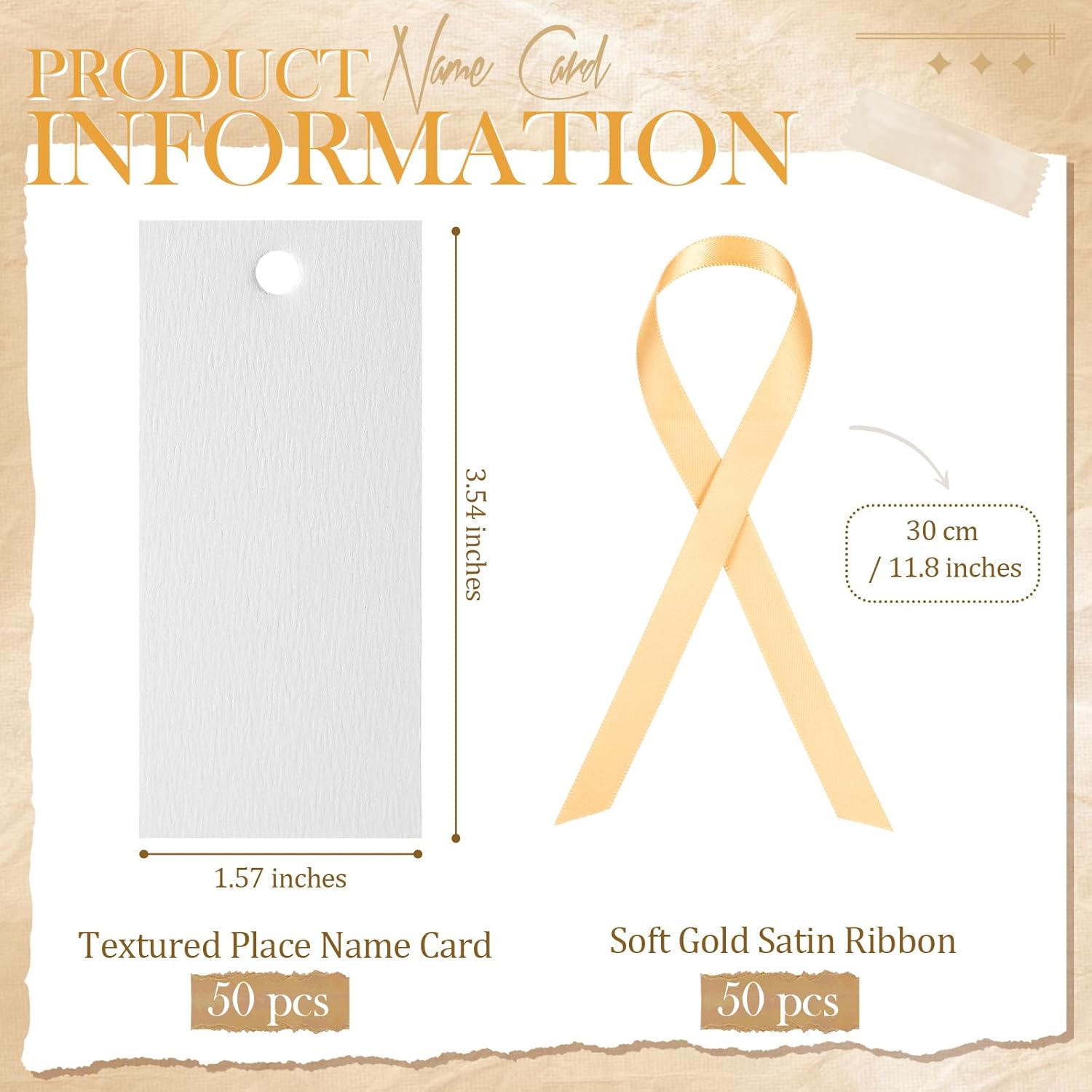 - Blank Name Card Tags Set: you will receive 50 blank textured paper name cards and 50 pre cut gold satin ribbons, which are sufficient to meet the needs of any event you hold; It is an ideal banquet table setting supplement