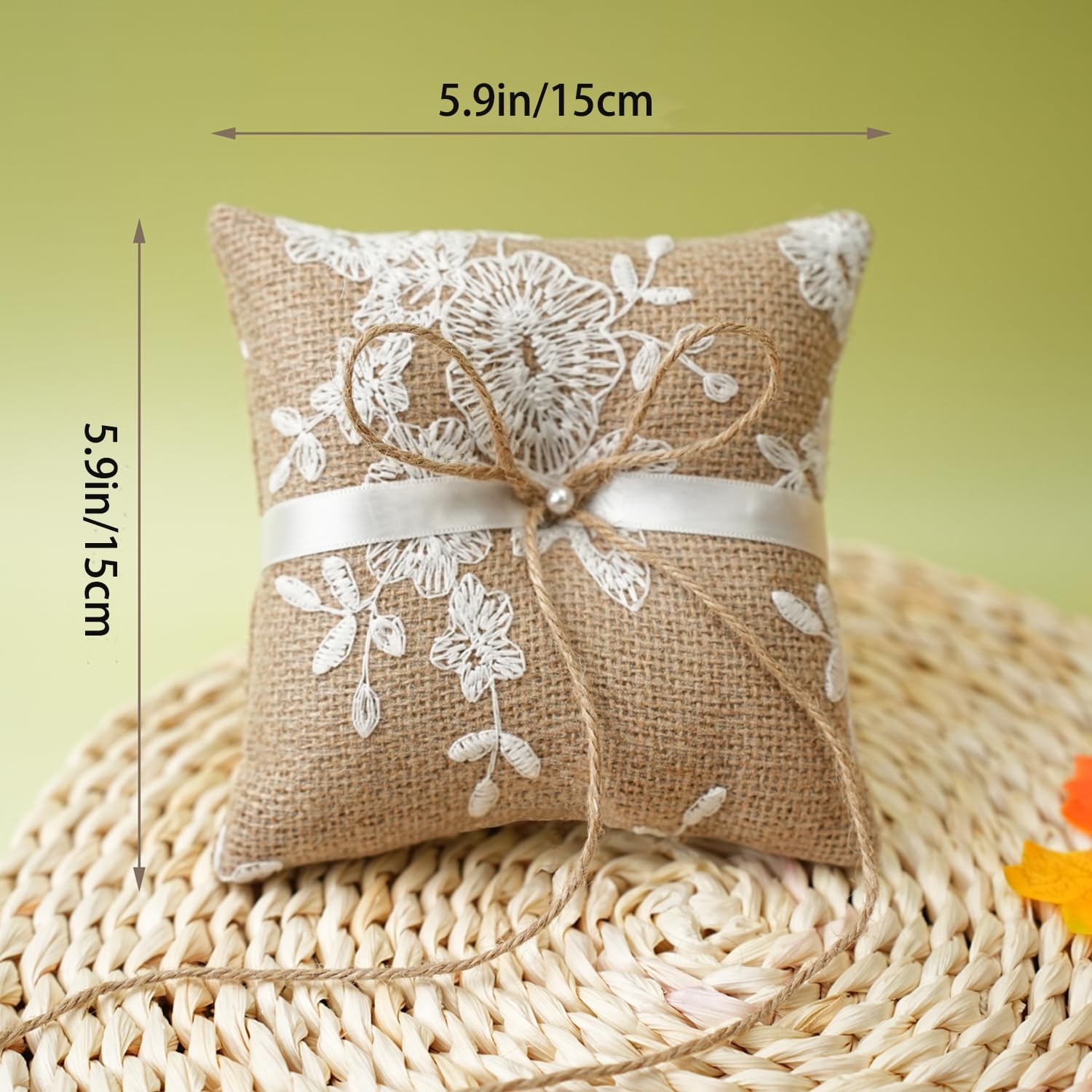 QIRMIZI 2PC Vintage Rustic Burlap Ring Bearer Pillow - Elegant Fall Wedding Décor with Lace, Bow, and Embroidered Flower Ribbon