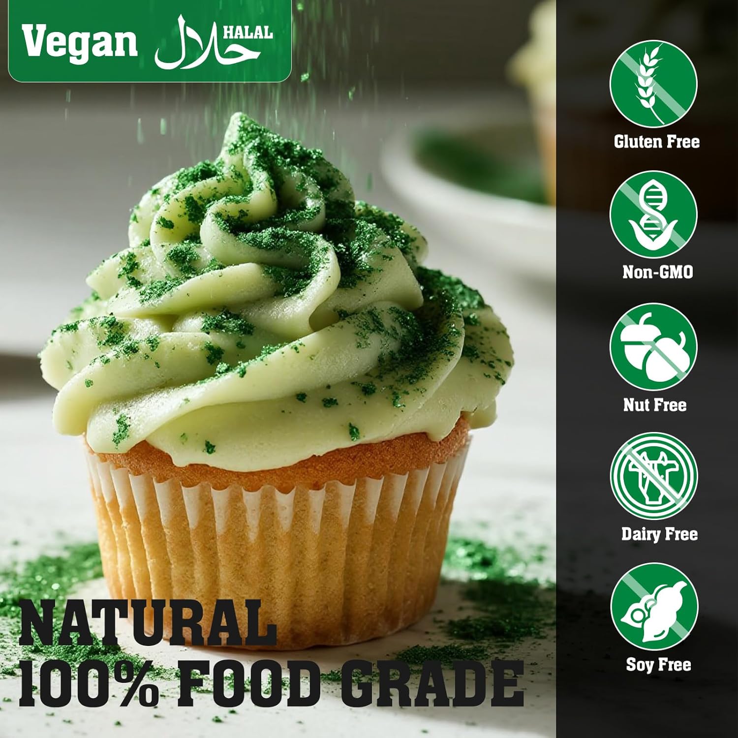 - 【Easy to Use & Versatile】: The edible glitter can simply apply dry with a brush, or mix with alcohol, lemon extract or oil-based flavorings for spray or brush application, or even mix into beverages. These edible luster dust is perfect for decorating frosting, fondant, whipped cream, cocktails, mocktails, champagne, and chocolates with a stunning Green shimmer effect.