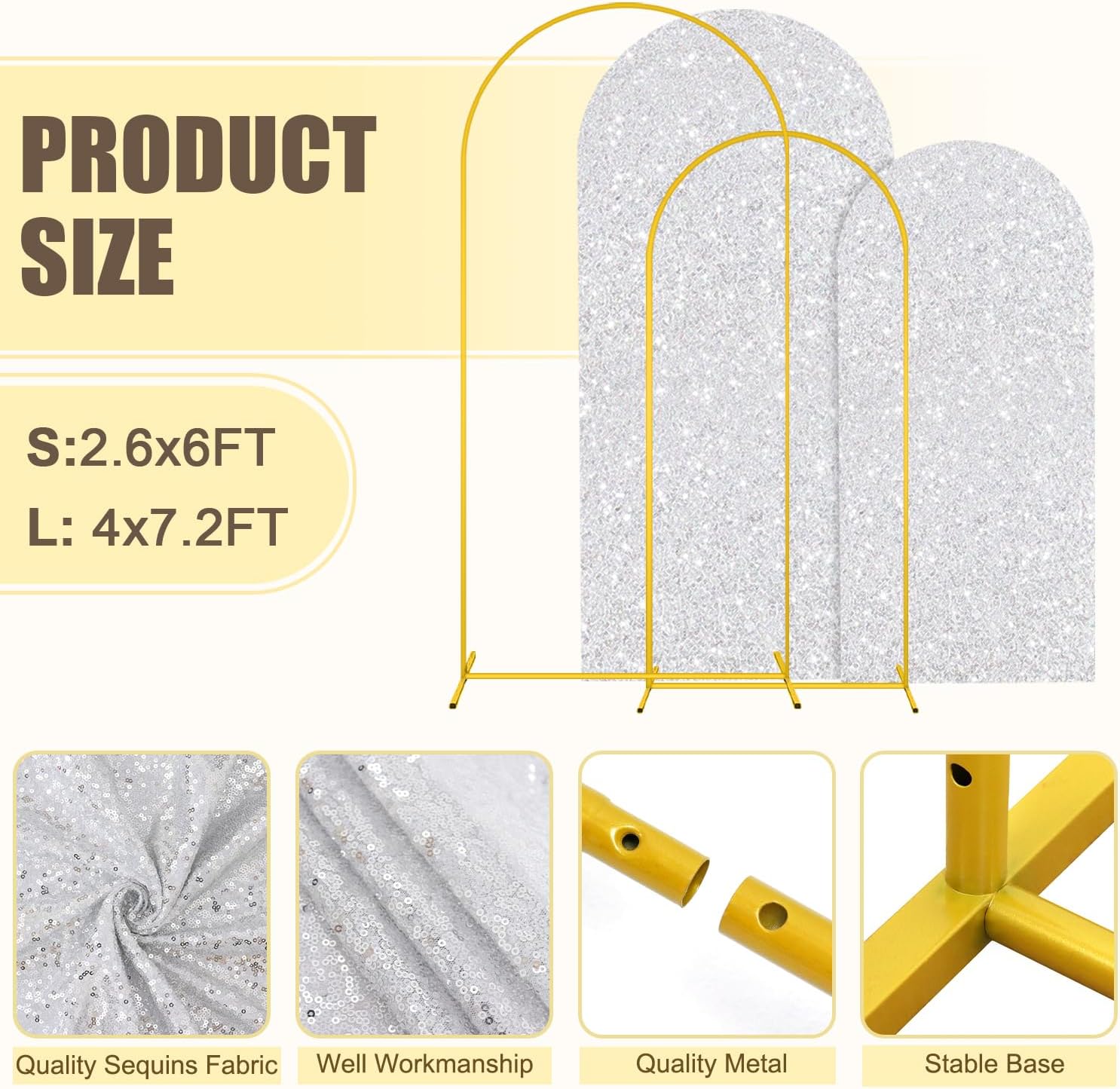 - ⭐Size Guide - Arch Backdrop Stand and Cover Set: The size of arch backdrop stand set about are 2.6FTx6FT(W x H), 4FTx7.2FT(W x H) with silver arch cover set. Metal arch backdrop stand set add a graceful and striking look for your party or event.
