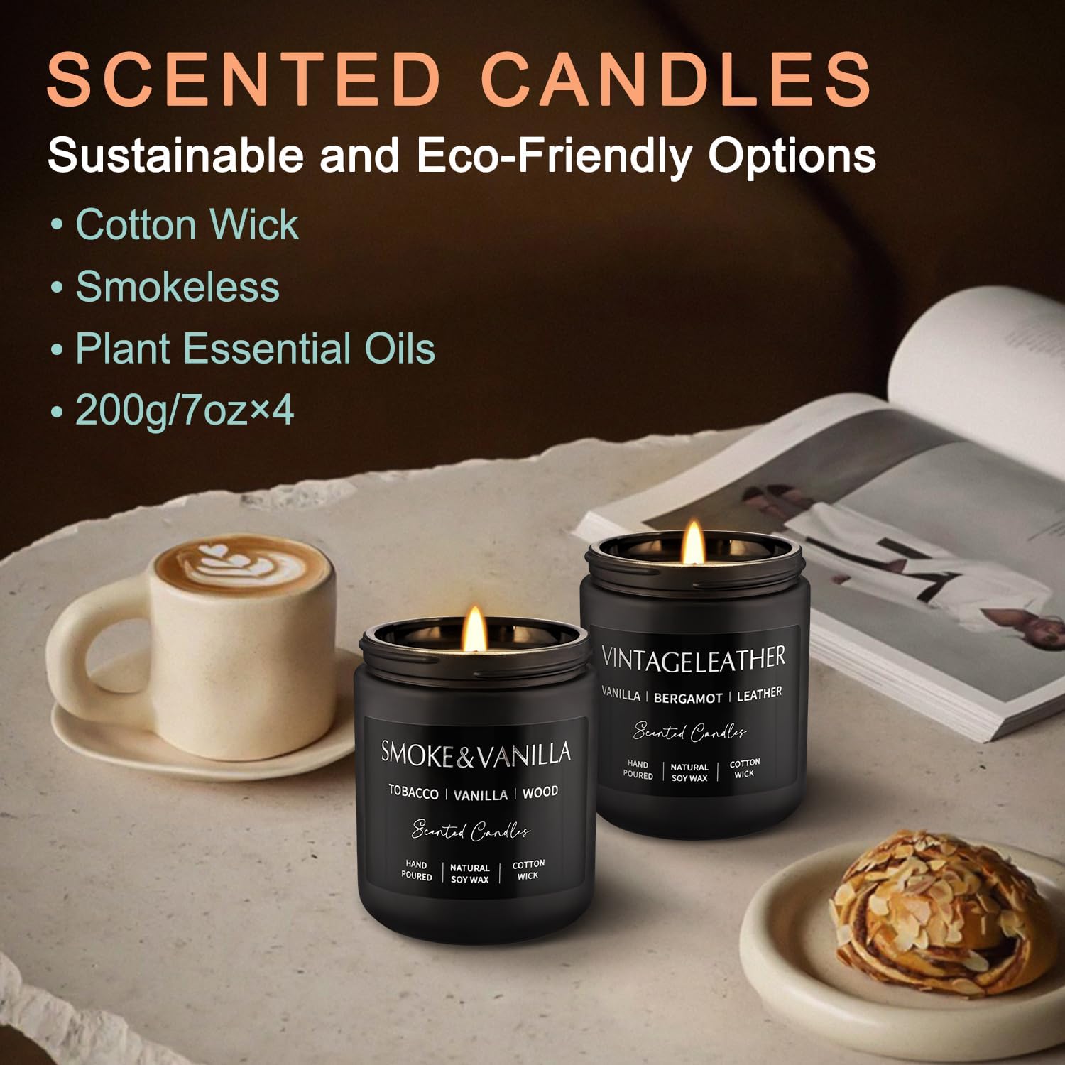 Scented Candles Gift Set - 4 Pack (7oz Each) Soy Wax Aromatherapy Candles with Essential Oils, Smokeless - Leather & Smoke, Vanilla Oakmoss, Lavender for Office, Gifts