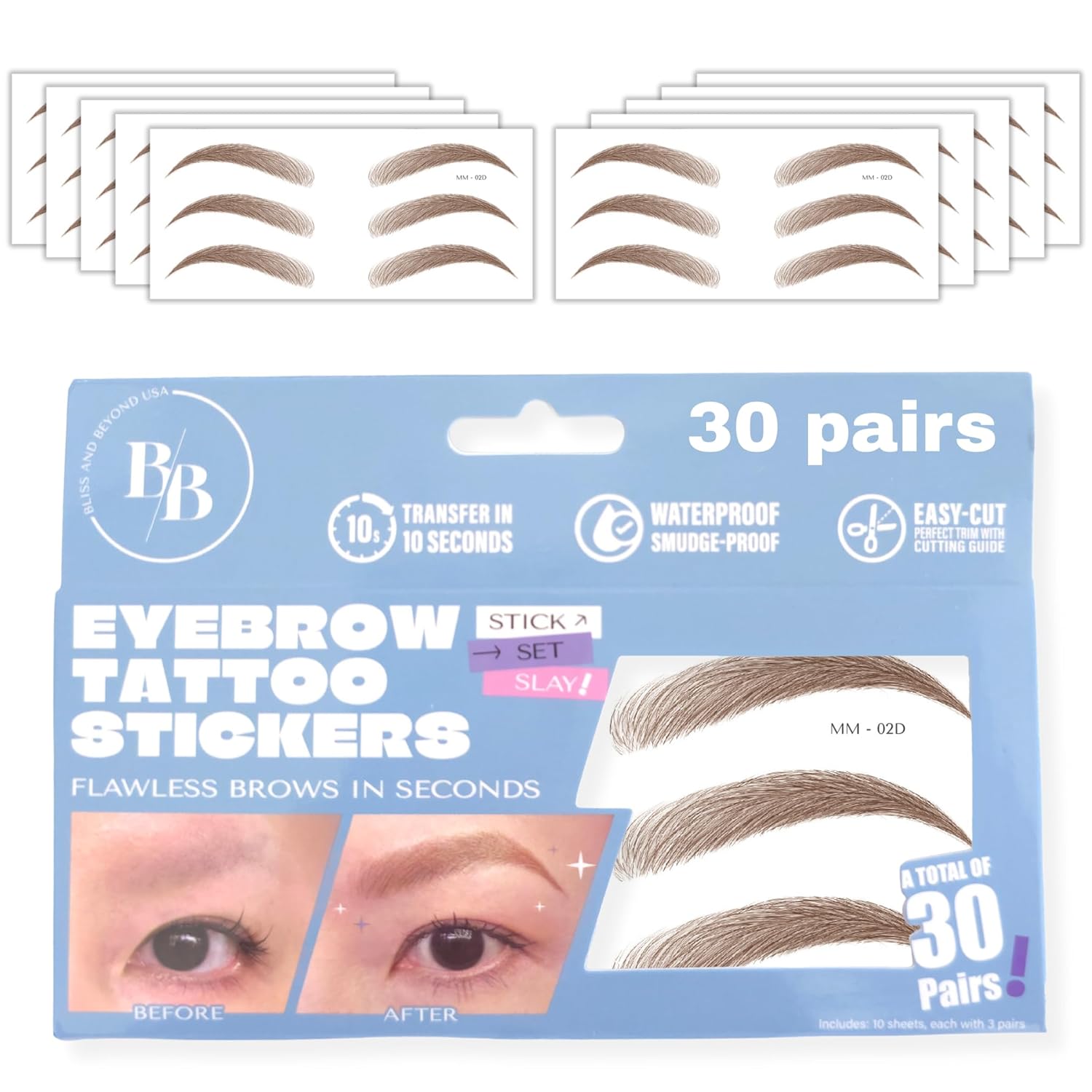 Bliss and Beyond USA Eyebrow Tattoo Stickers Waterproof – 30-Pair Deluxe Box | Realistic Hair-Like Temporary Brows for Alopecia, Cancer, and Hair Loss (Brown, Dramatic Miami)