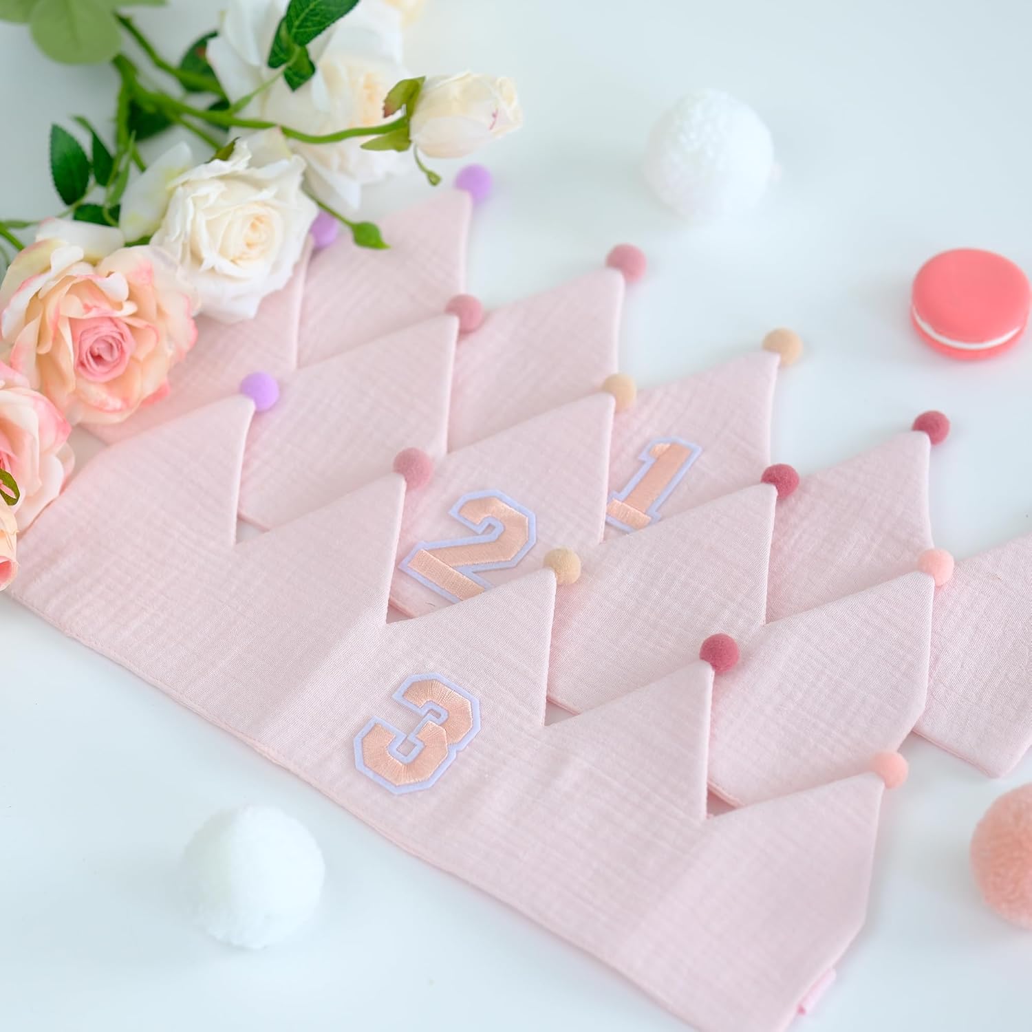 • Special Design:It is made of muslin;The design of a crown shape and the combination of pompoms make your baby look more adorable;It's soft and won't make your baby uncomfortable;Hand wash is recommended for daily care and can be reused