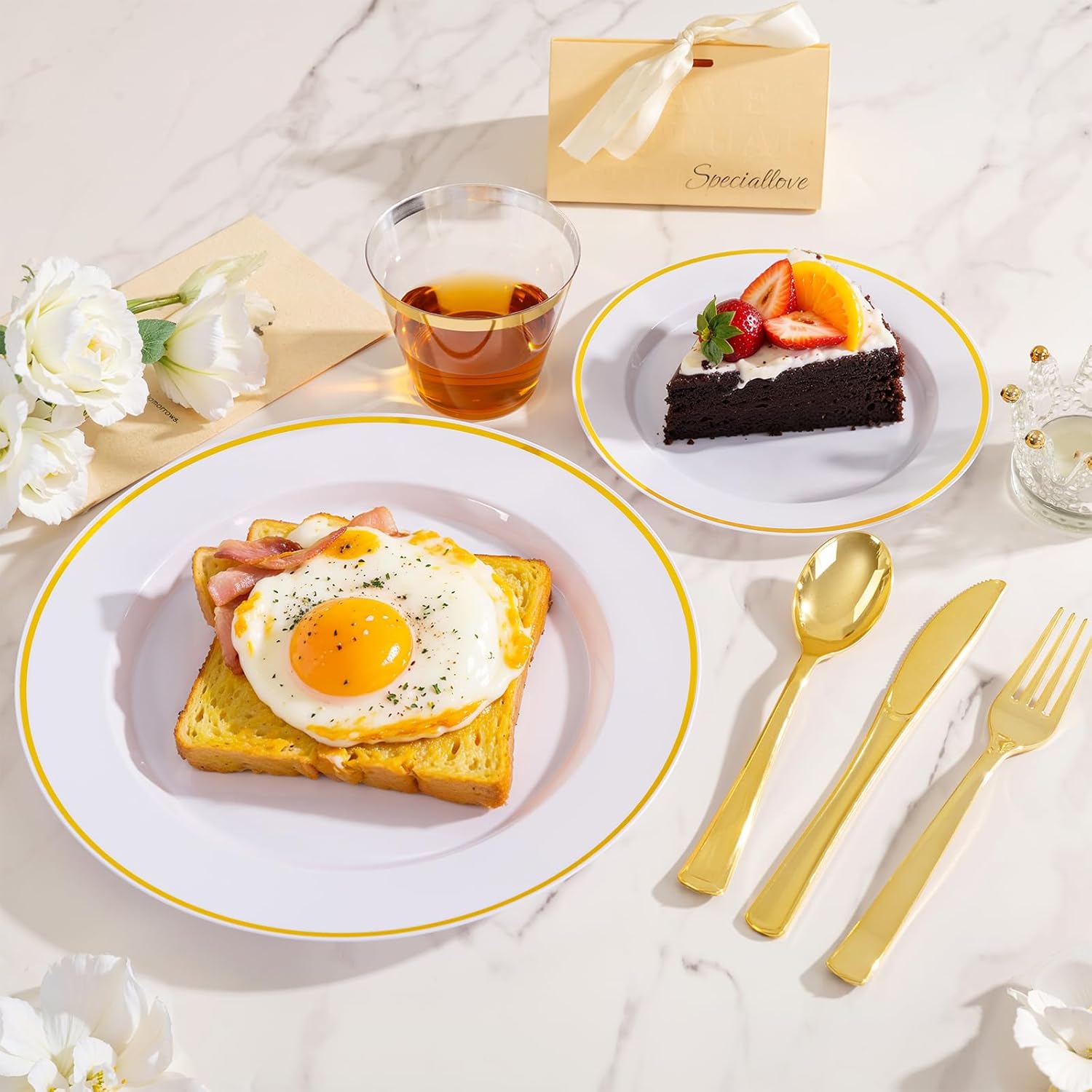- ELEGANT GOLD AND WHITE DESIGN: Enhance your event with our SUT disposable plates featuring a stylish gold rim and white design, perfect for any occasion like weddings, birthday parties, or formal dinners. This set of plastic plates not only looks magnificent but also provides a sophisticated touch to your table setting.