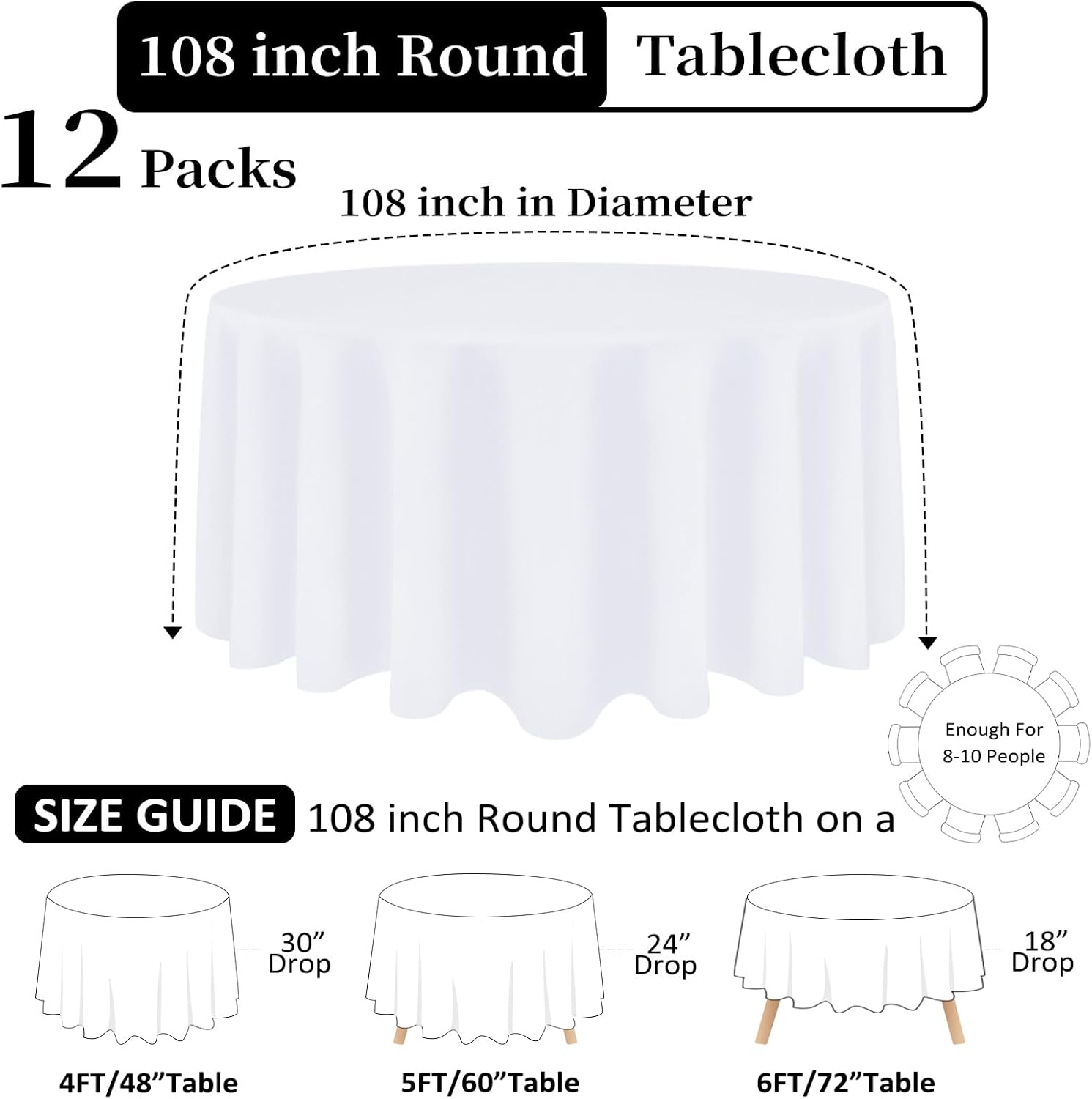 - Measurements and Colors: This white cloth tablecloths is 108 inches in diameter, perfect for standard 6FT(72") round tables, providing a 18" drop, or 24" if your round table is 5FT (60"). This table cloth round cover is available in totally 5 colors. Youβll be able to choose a luxurious and ideal table cover for your table. Please measure the size of your table before purchasing.