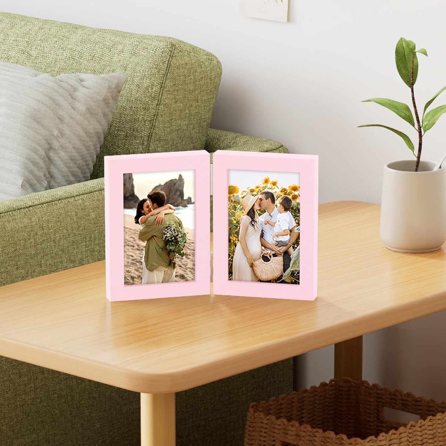 decorUhome Double 4x6 Picture Frame Vertical, Engineered Wood Bifold Photo Frame with Plexiglass for Tabletop Display, 4x6, Pink
