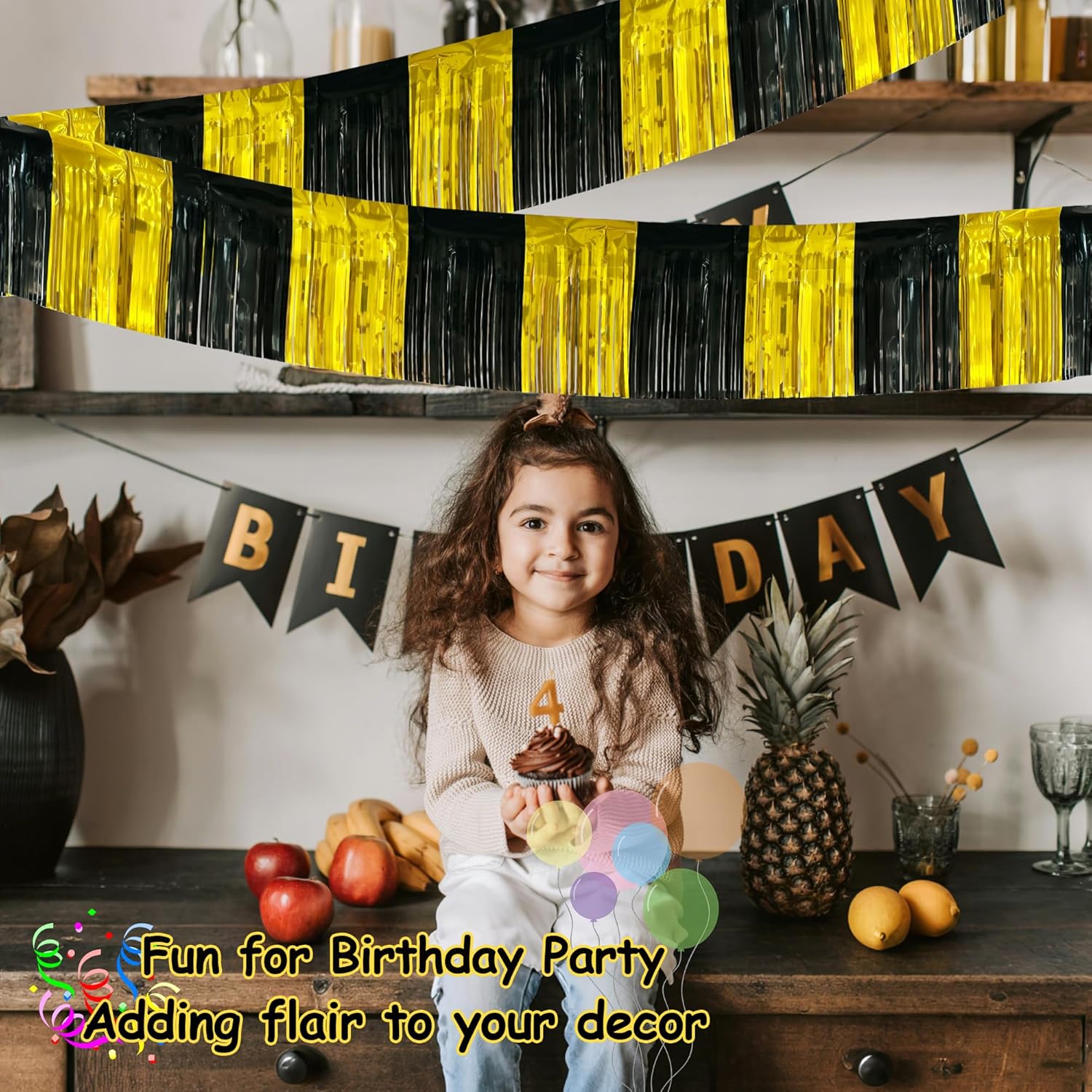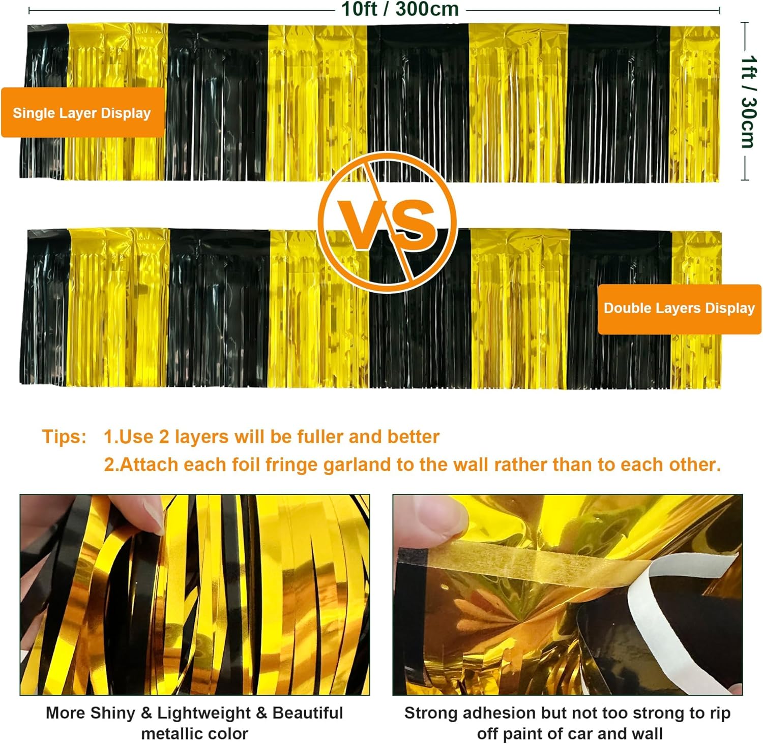 - ✨【ADDING FLAIR】✨The black gold foil fringe garland serves as an awesome party decoration trim, fancy up a party. Hang it on the wall as an iridescent shiny backdrop for photos, your friends will be very happy to take pictures in front of the foil garland background. Hang some foil garland in the windows, attach them to the ceiling, decorate the dessert table as a table skirt or make an elegant entrance curtain for your guests. Your guests will be impressed with your creative party