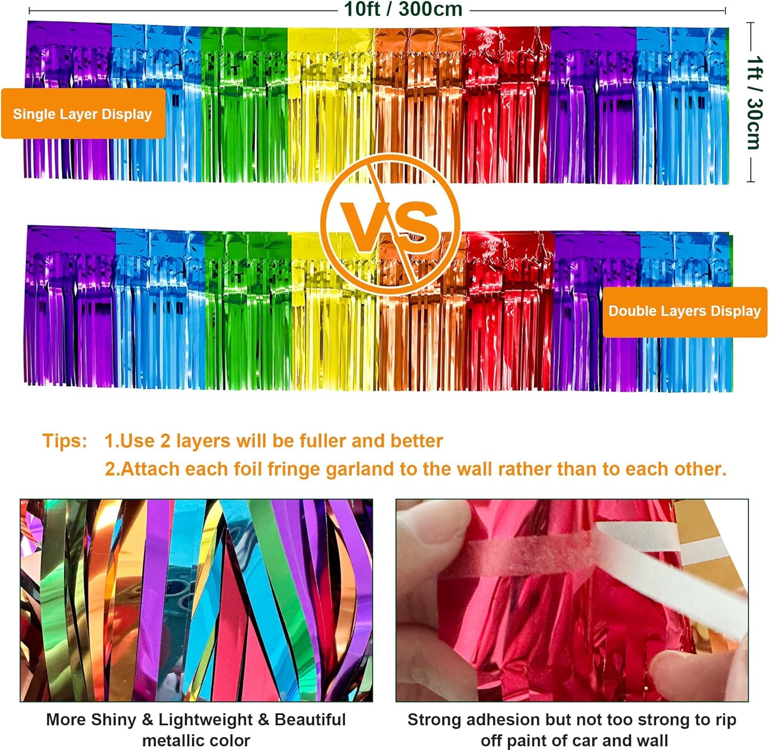 - 【PARTY SUPPLIES】Serves as an awesome party decoration trim, the Rainbow foil fringe garland will fancy up a party. Hang it on the wall as a shiny backdrop for photos, your friends will be very happy to take pictures in front of the foil garland background. Hang some foil garland in the windows, attach them to the ceiling, decorate the dessert table as a table skirt or make an elegant entrance curtain for your guests. Your guests will be impressed with your creative party!