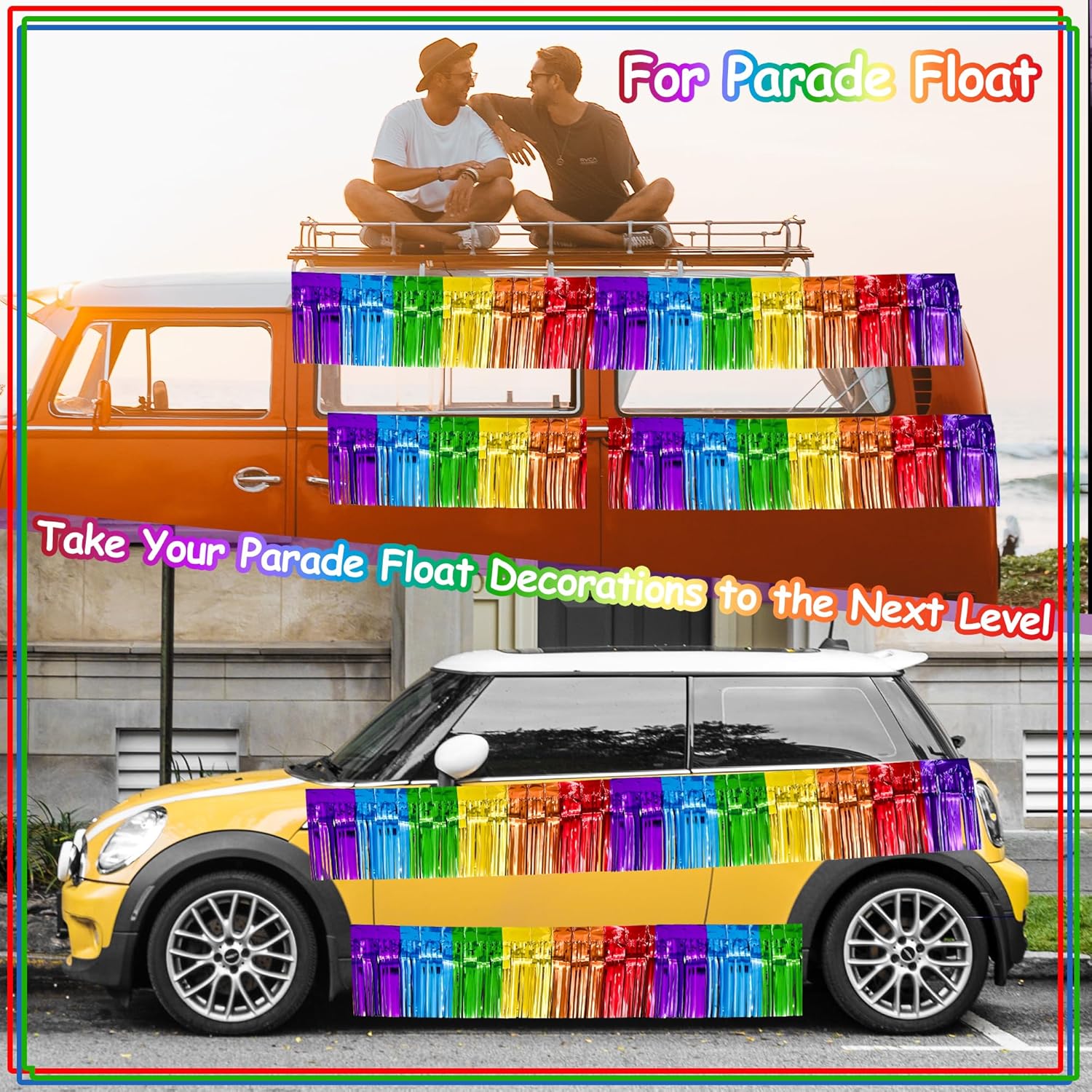 - 【ATTRACTIVE AND FUN】 These Rainbow fringe foil with double stick tape at the back for easy mounting and removing. Strong adhesion but not too strong to rip off car/wall paint, this parade float will not be blown away by the wind, they can stay hanging for days. PET material, lightweight, and looks more shiny and glittery in the light. Very attractive, perfect for car decoration, graduation floats, Halloween parades, and pride party, Rainbow themed party decoration etc.