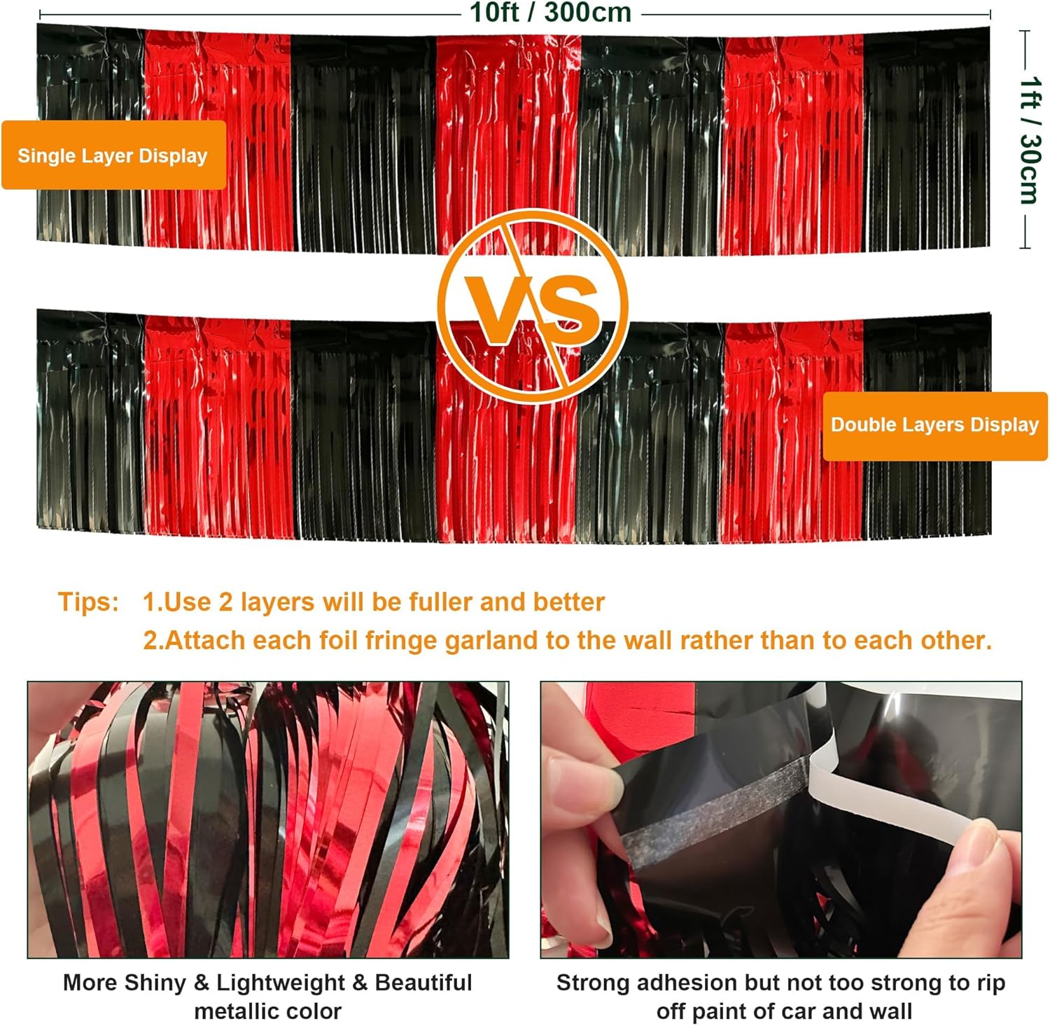 - ✨【ADDING FLAIR】✨The black & redfoil fringe garland serves as an awesome party decoration trim, fancy up a party. Hang it on the wall as an iridescent shiny backdrop for photos, your friends will be very happy to take pictures in front of the foil garland background. Hang some foil garland in the windows, attach them to the ceiling, decorate the dessert table as a table skirt or make an elegant entrance curtain for your guests. Your guests will be impressed with your creative party!