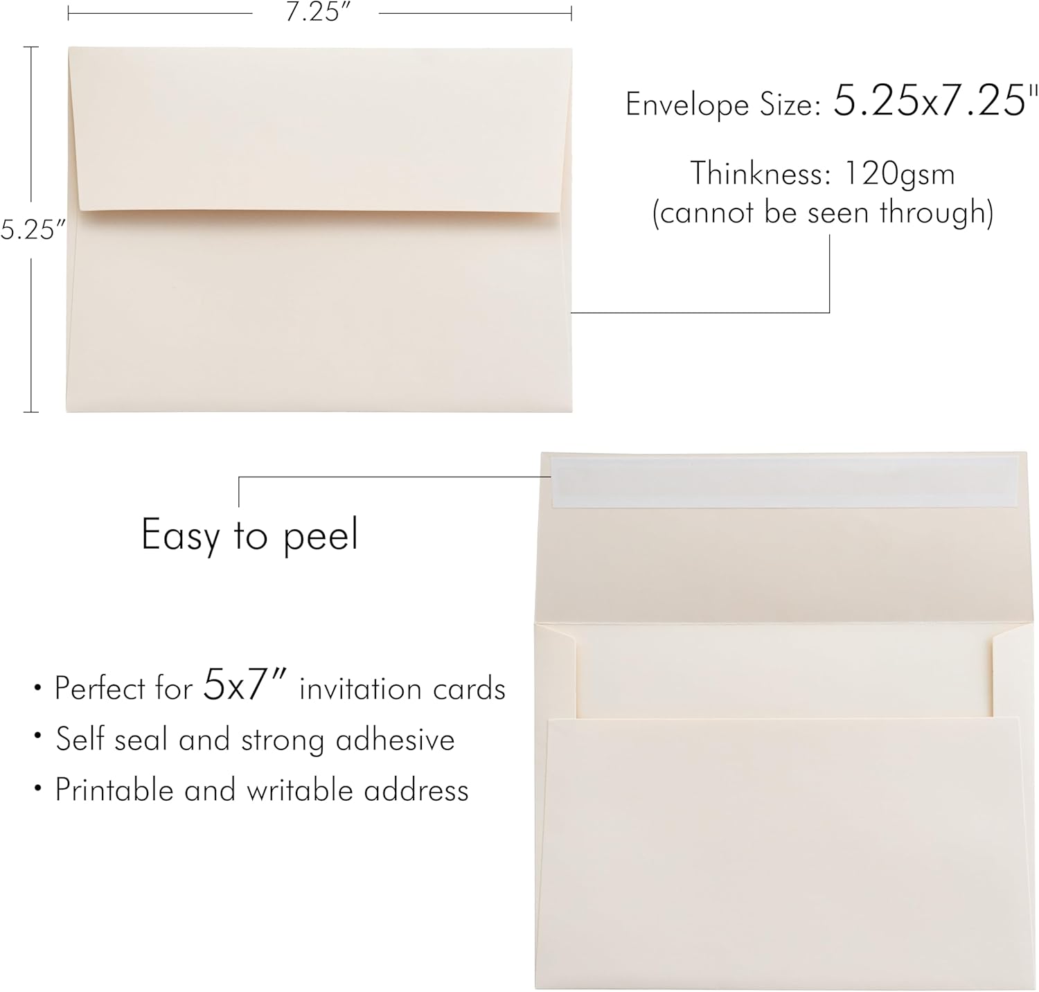 PONATIA 50 PCS 5x7 Envelopes, Self- Adhesive Cream A7 Envelopes for Weddings, Invitation Cards, Photos, Postcards, Greeting Cards Mailing, Baby Shower, Graduation, Christmas Gift Cards
