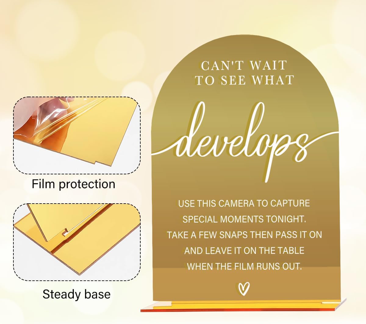 - 【Suitable Size】: Each wedding sign comes with a small acrylic base; the sign measures about 5 x 7 inches, and the acrylic base is about 4.3 x 1.2 inches. Each mirrored arch acrylic wedding sign has a protective film to prevent scratches, which should be torn off when ready to use.