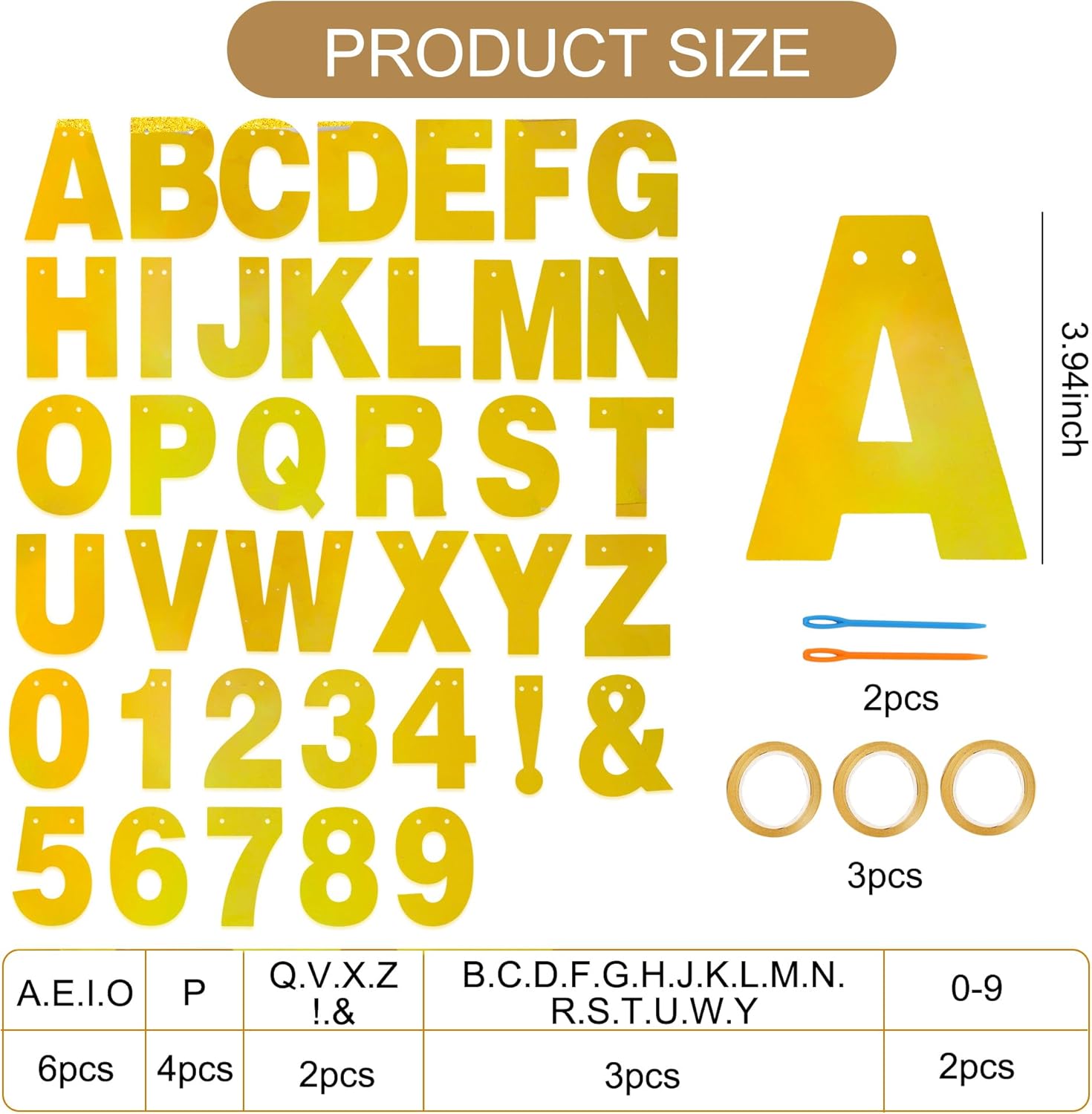 - PACKAGE INCLUDES:There are a total of 111 letters and numbers, 3 ropes, and 2 threading devices.Detailed number of letters and numbers: 6pcs of the letters 'A,E,I,O', 4pcs of the letters 'P', 2pcs of the letters 'Q,V,X,Z,! &',3pcs of the letters 'B,C,D,F,G,H,J,K,L,M,N,R,S,T,U,W,Y', and the numbers 0-9 are 2pcs each. Each letter is 3.94 inch