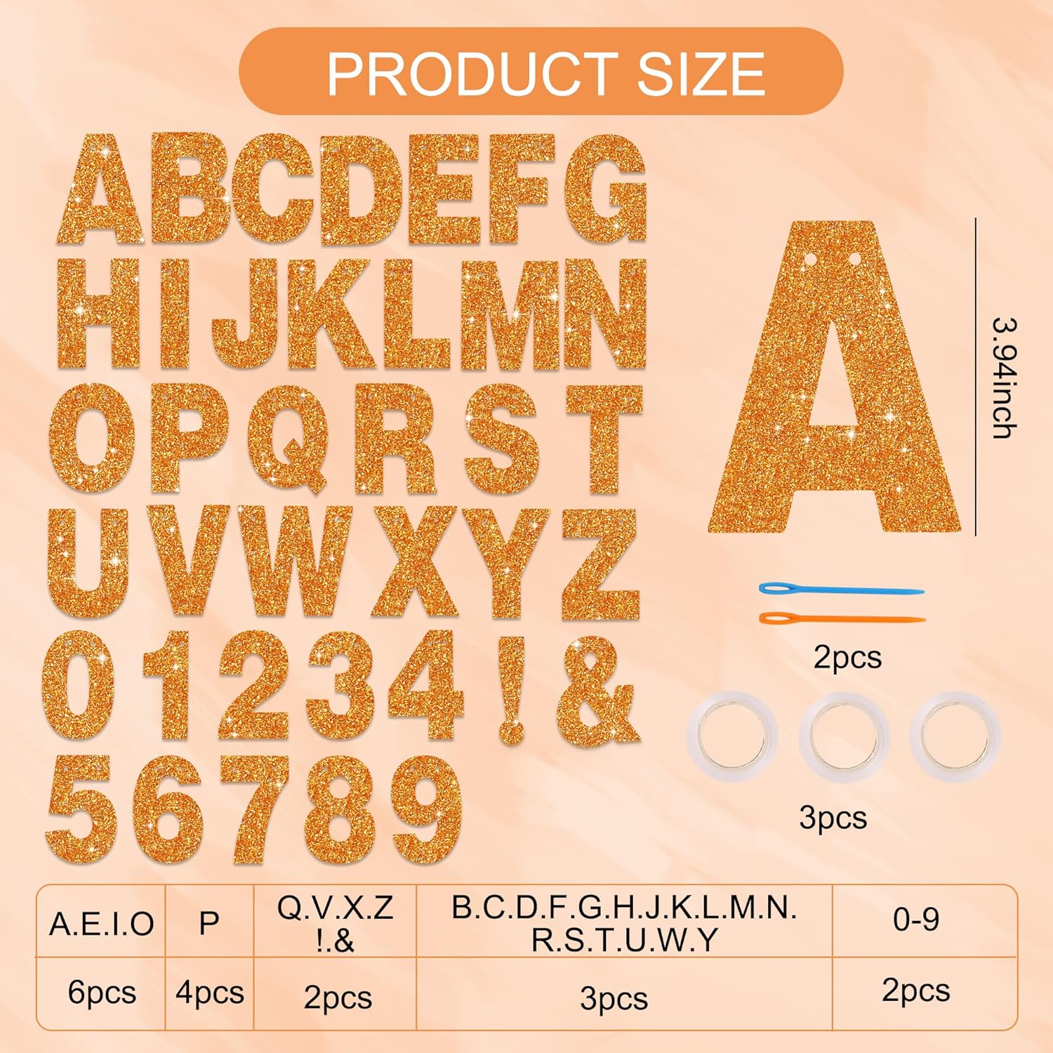 - PACKAGE INCLUDES:There are a total of 111 letters and numbers, 3 ropes, and 2 threading devices.Detailed number of letters and numbers: 6pcs of the letters 'A,E,I,O', 4pcs of the letters 'P', 2pcs of the letters 'Q,V,X,Z,! &',3pcs of the letters 'B,C,D,F,G,H,J,K,L,M,N,R,S,T,U,W,Y', and the numbers 0-9 are 2pcs each. Each letter is 3.94 inch