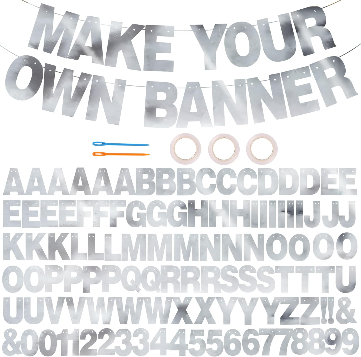 BEISHIDA Double-sided Silver 116 PCS DIY Letter Banner Kit Make Your Own Banner,Including 111 Letters and Numbers 3 Rope and 9 Threading Device,Customized for Birthday Graduation Wedding Decor