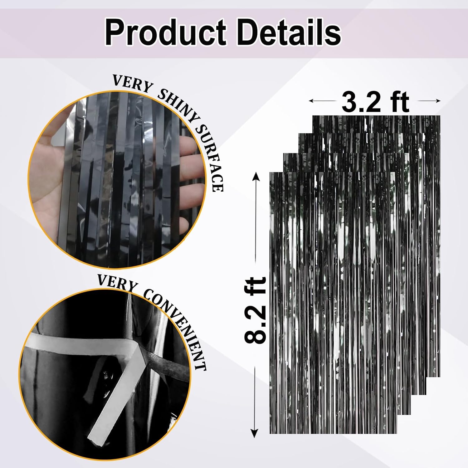 4Pack Black Foil Fringe Curtains Black Streamers Backdrop for Party Decorations, Wedding, Graduation, Halloween, Birthday, Photo Booth Props