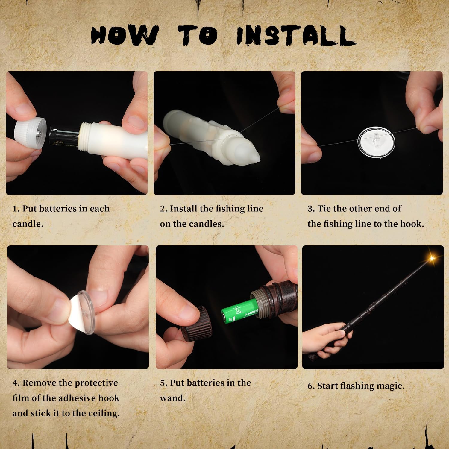 - ๐๐ฆ๐๐ณ๐ข๐ง๐ ๐๐๐ ๐ข๐๐๐ฅ ๐ ๐ฅ๐จ๐๐ญ๐ข๐ง๐ ๐๐๐๐๐๐ญ: Floating candles with wand come with a bundle of clear fishing line and 13 adhesive hooks for easy hanging in mid-air, creating a magical and whimsical feel to any space. Floating candles are a fantastic addition to any Halloween setup or themed party. The floating effect will wow all the trick-or-treaters.