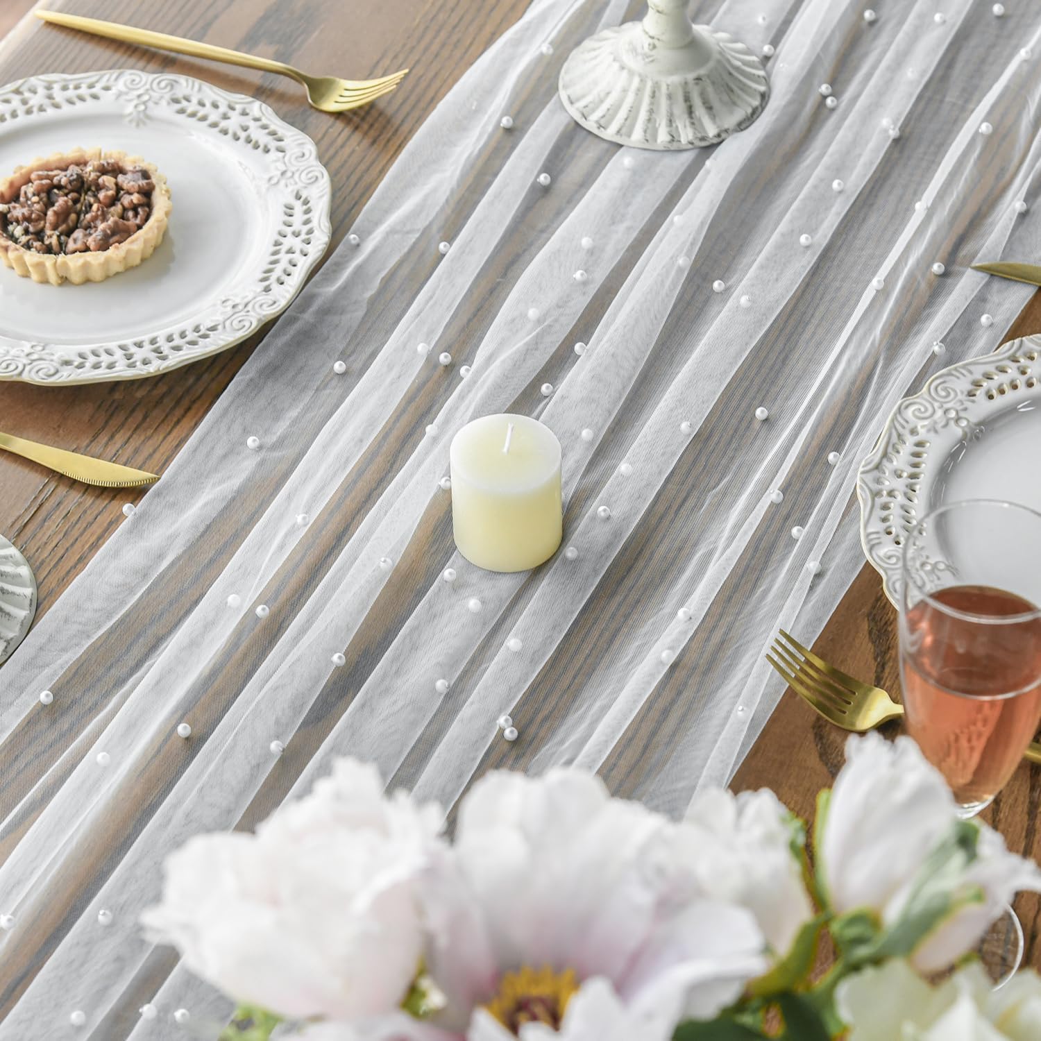 Artoid Mode 3PCS Pearl Gauze Table Runner 120 Inch 10FT, Seasonal Sheer Dining Holiday Wedding Birthday Baby Shower Table Decor for Home Party
