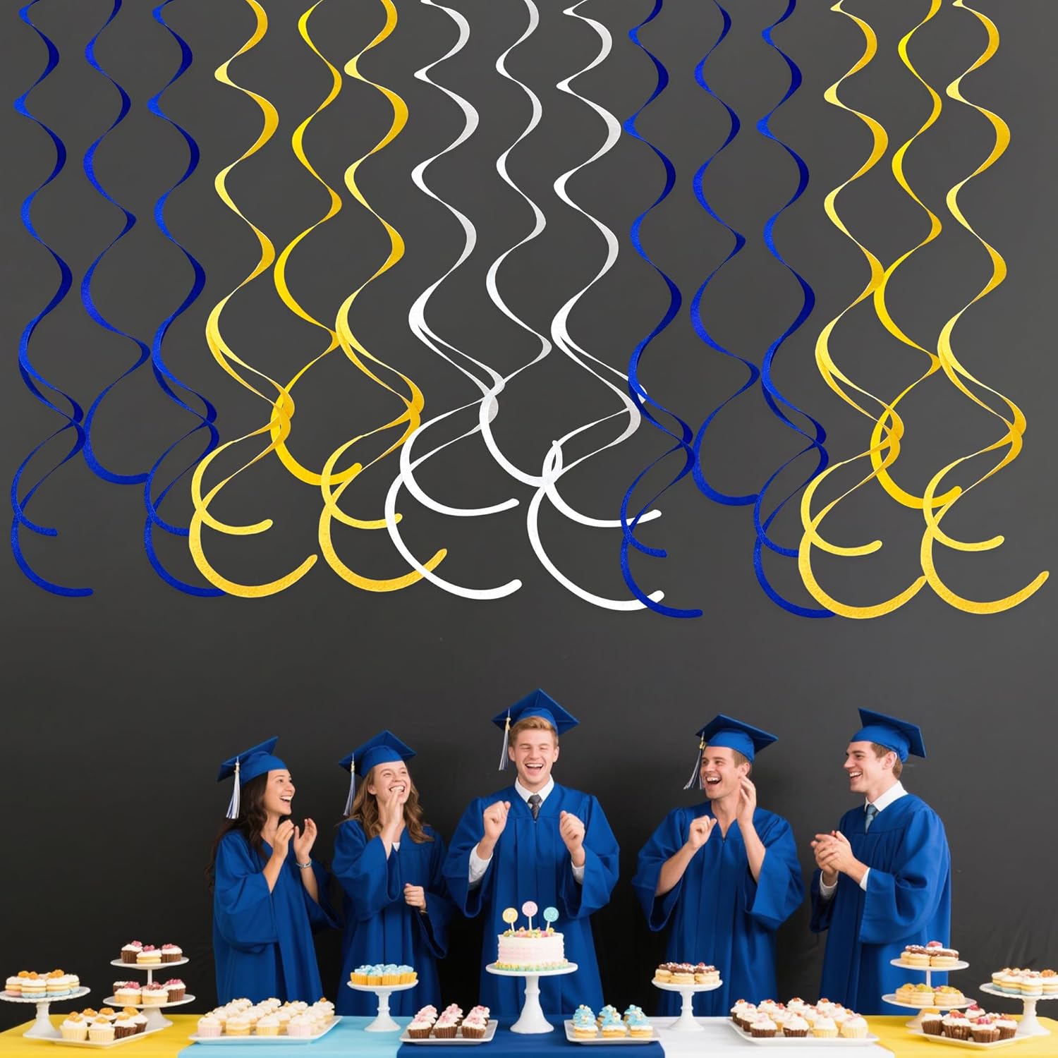 - Package Contains - 36 packs of yellow blue white color swirl party streamer, Each swirl can extends to approximately about 2.62 feet long,Meeting daily general needs.Comes with 40 plastic hooks for hanging.