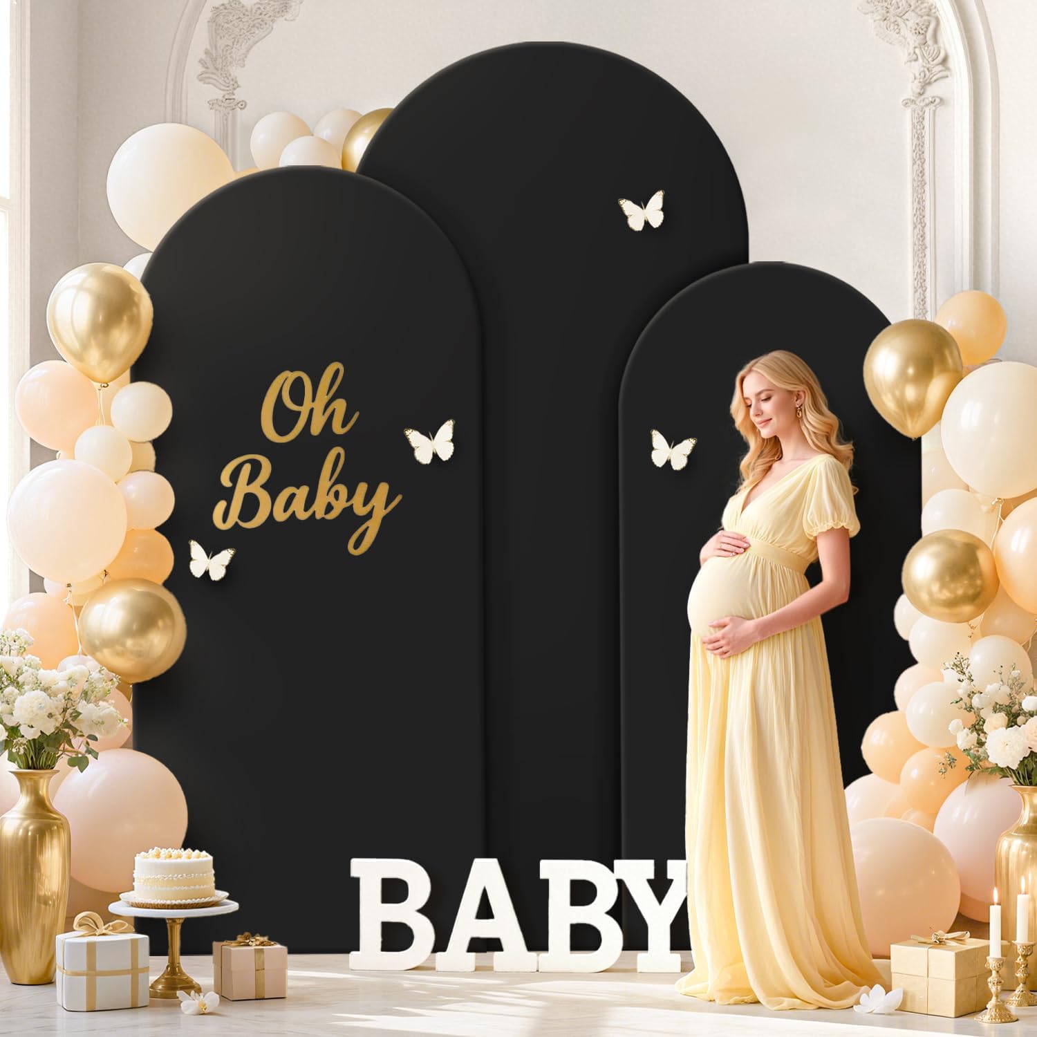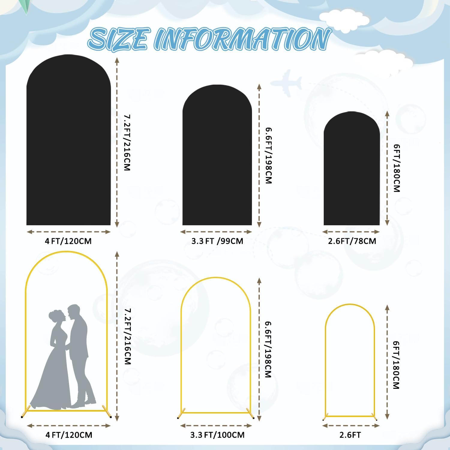 - đ§¸ăSize Information- Arch Backdrop Stand and Cover SetăArch stand and cover set includes 3 gold metal arch backdrop stands and 3 black arch backdrop cover in sizes 7.2FT x 4FT(H x W), 6.6FT x 3.3FT(H x W) and 6FT x 2.6FT(H x W). The backdrop arch stand with cover is certain to meet your decoration needs and add a charming look to your celebrations.
