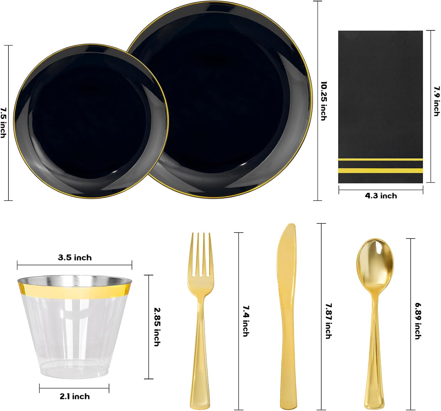 - VALUE PACK FOR 50 GUESTS: NOCCUR black and gold disposable plates contain 50 black dinner plates, 50 black dessert plates, 150 gold plastic cutlery, 50 cups and 50 napkins. These black plastic plates are enough to hold a wonderful party for 50 guests!