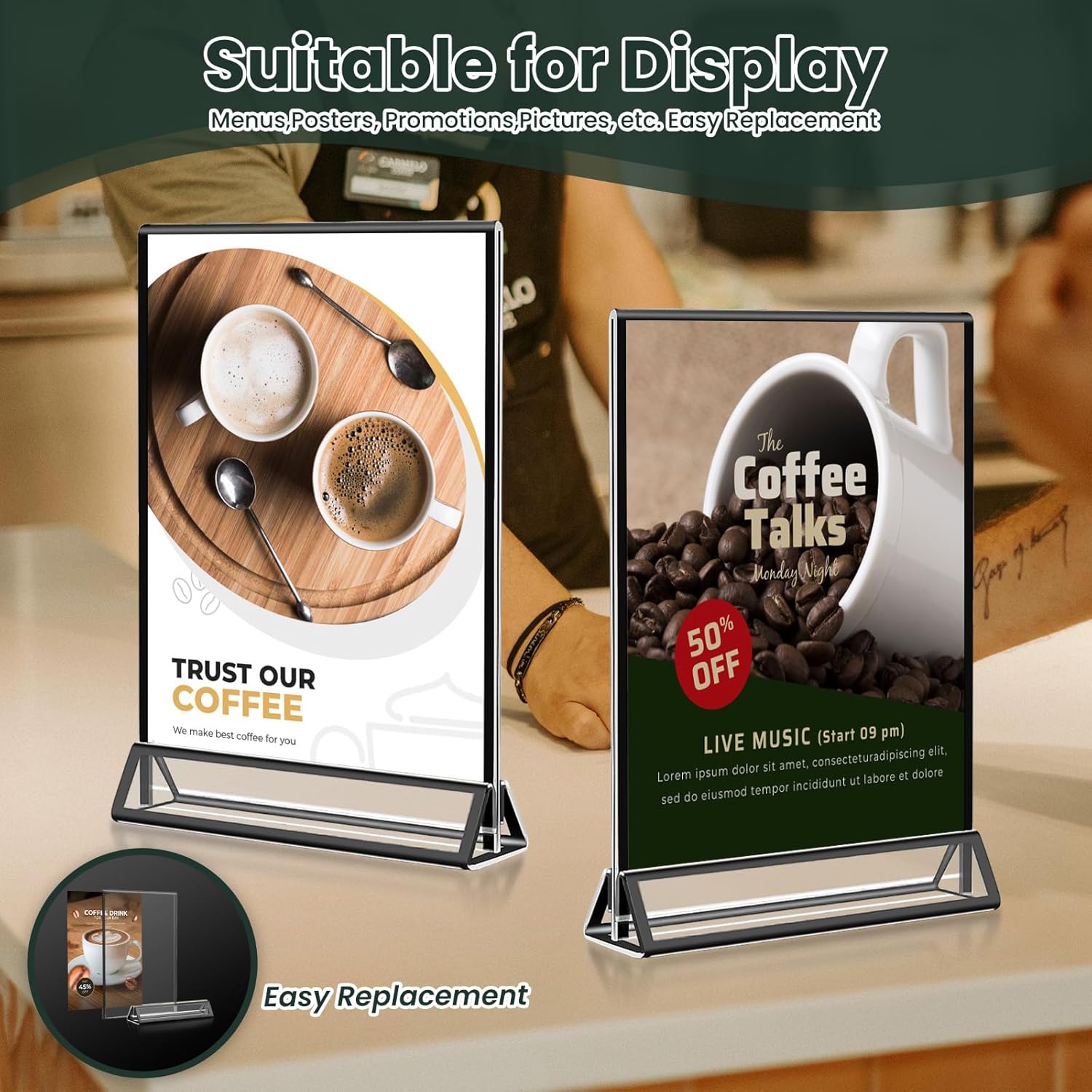 - 【Double-Sided Display Design】This uniquely designed 15 Pack 4x6 black acrylic sign holder features a back-to-back double-sided display design. Its vertical double-sided structure ensures clear visibility of two photos or menu signs, making your table arrangement practical and visually appealing from any angle.
