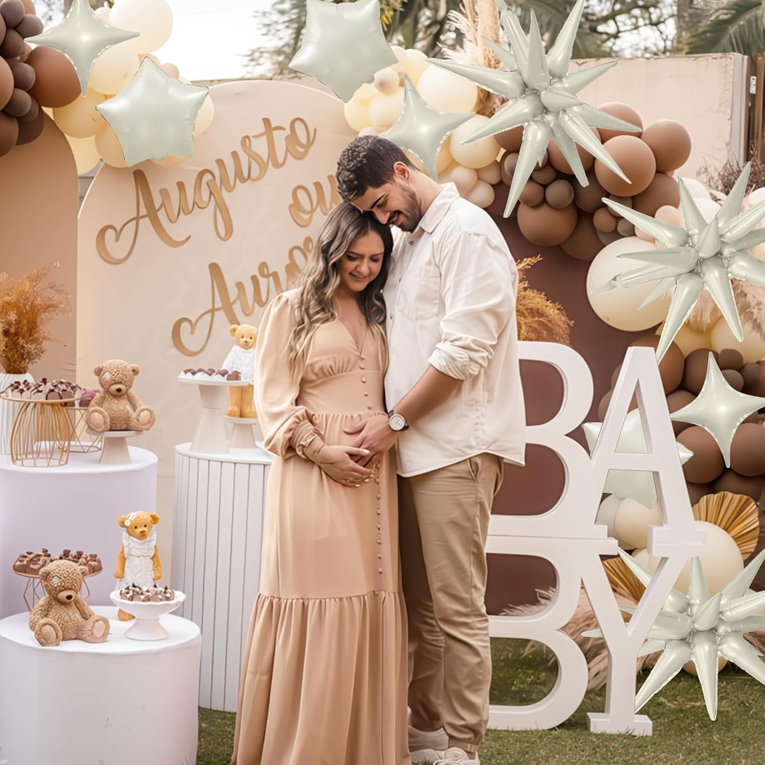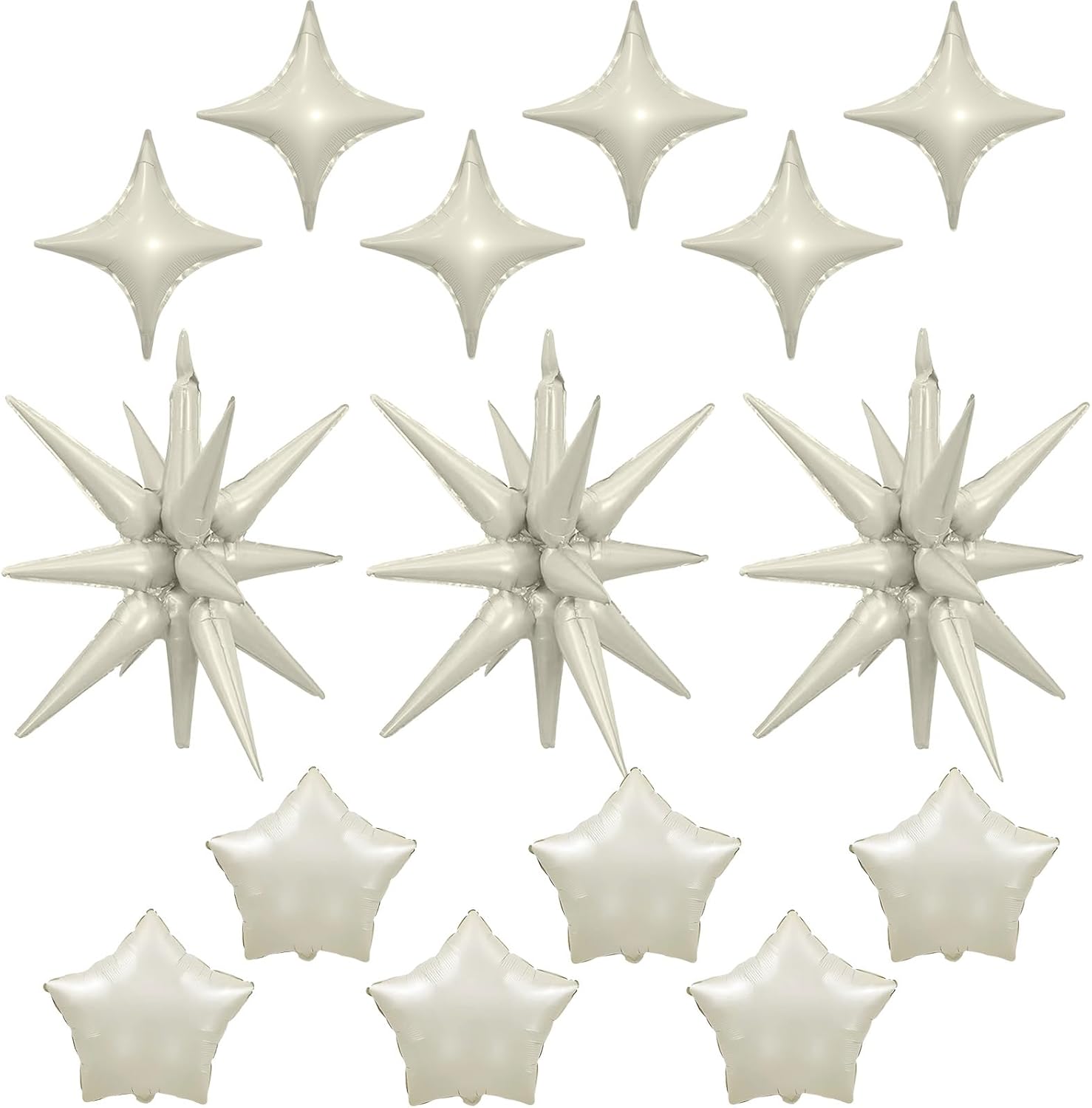 - White Sand Star Balloons: Package includes: cream aluminum foil star balloons (explosion spike Γ 3, four-pointed stars Γ 6, five-pointed stars Γ 6) , a straw and ribbon