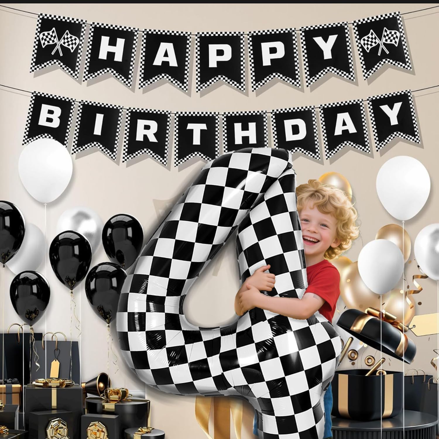 40 Inch Checkered Number Balloon - Race Flag Pattern Big Helium Balloon for Birthday Party Decorations - Black & White Balloon for Kids Adults Party Supplies (Racing Car, Number 4)