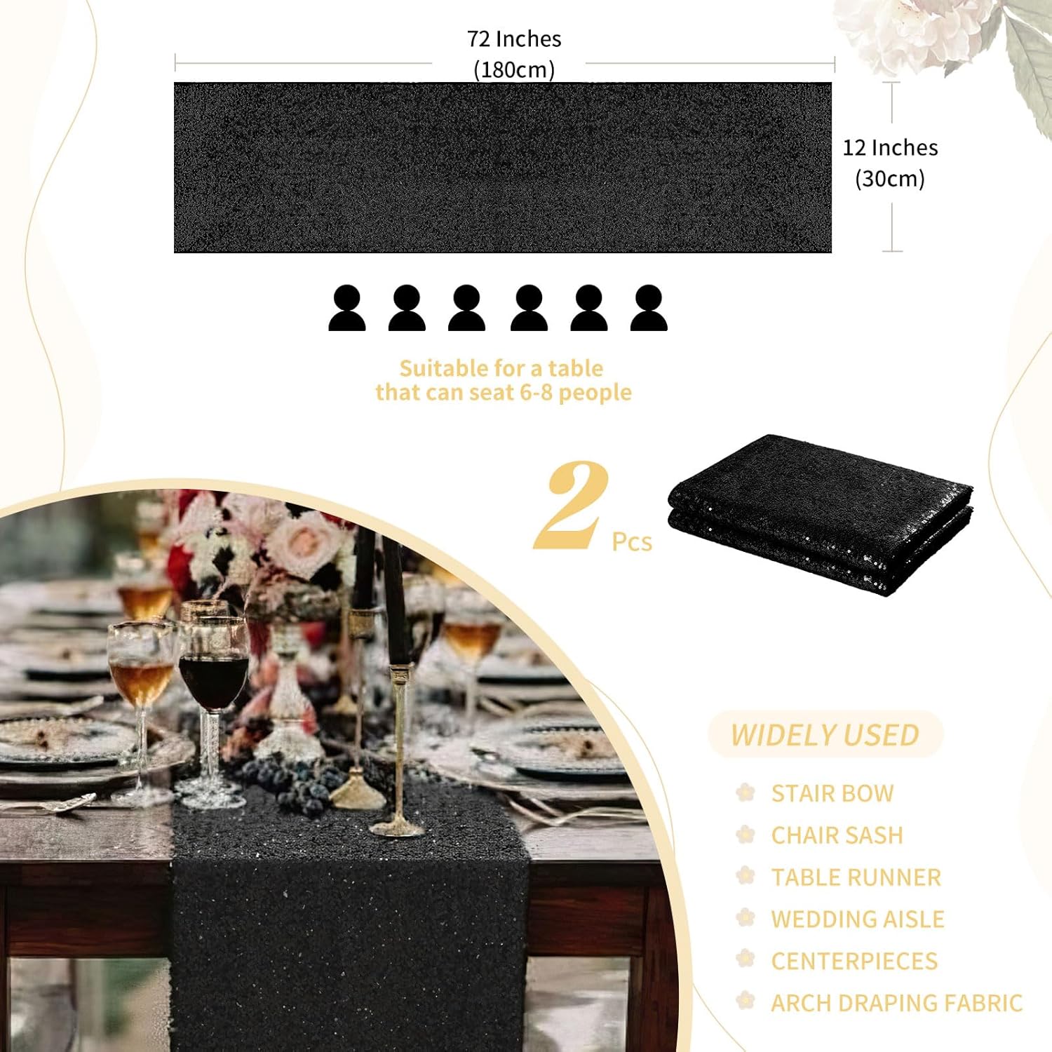 - Black Sequin Table Runners: Package includes 2 pack of black table runners for your daily use. Measured about 12x72 inches(30x180cm). Great ideal for wedding table decorations for the receptionthe sequin table runners is long enough to fit rectangle and round tables that can seat 6 to 10 people.