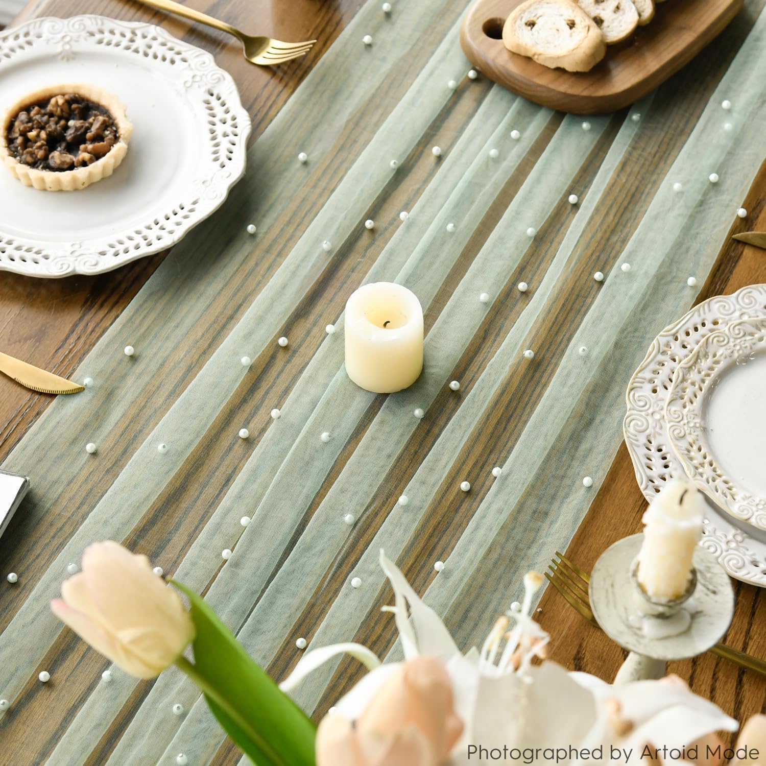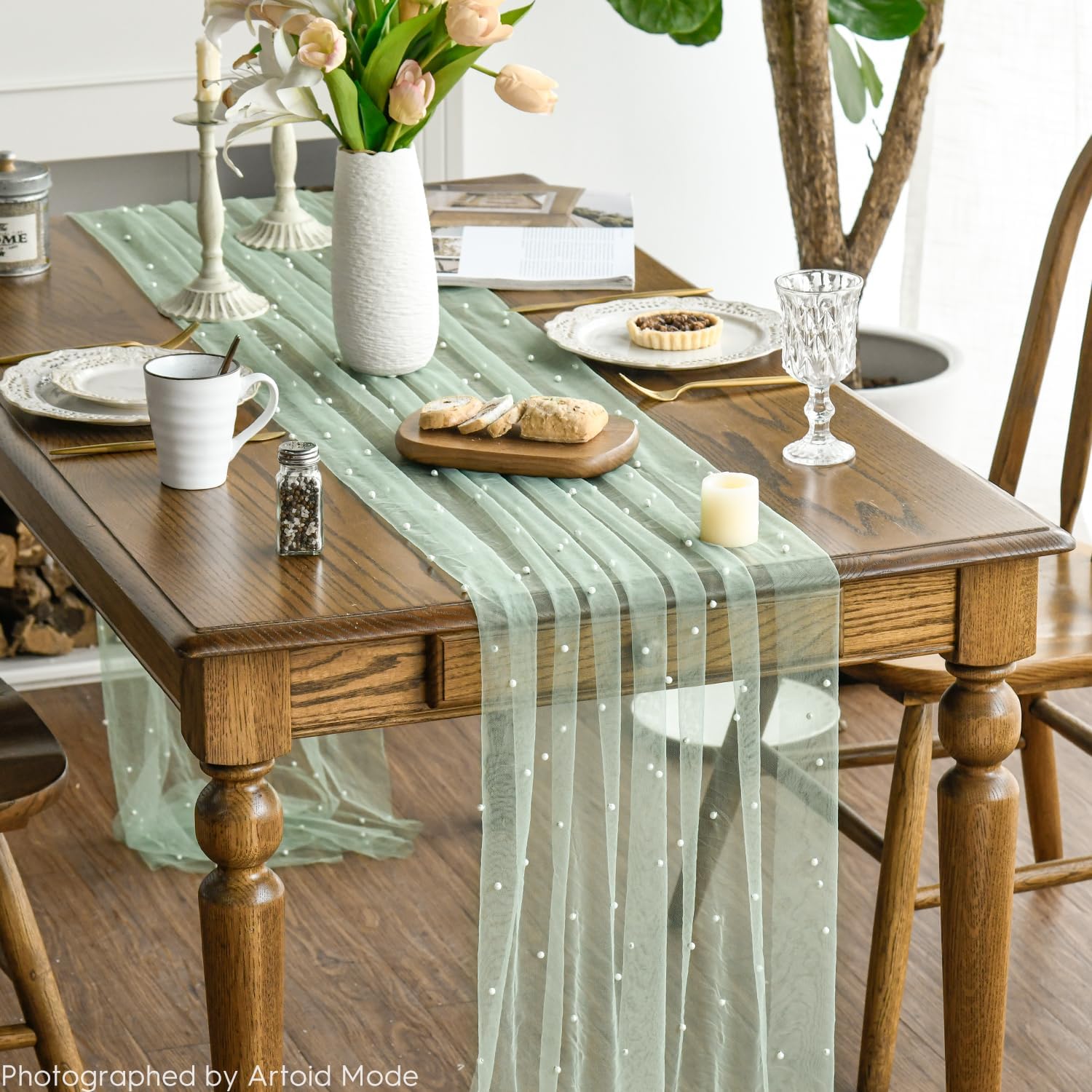 Artoid Mode Pearl Grass Green Gauze Table Runner 59x120 Inch , Seasonal Sheer Kitchen Dining Holiday Wedding Birthday Baby Shower Table Decor for Home Party