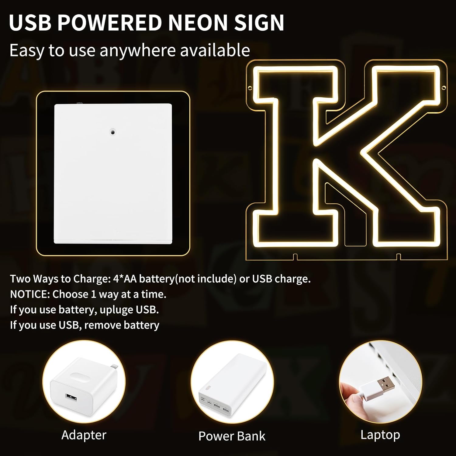 - 13" x 13.6" Letters K Light Up Sign! Whether it’s a birthday bash, wedding, kids' room, home decor, or a special event, this Letter K Neon Sign is the ultimate vibe booster! It’s also the perfect gift for Valentine’s Day, Christmas, or any occasion—your loved ones will adore it!