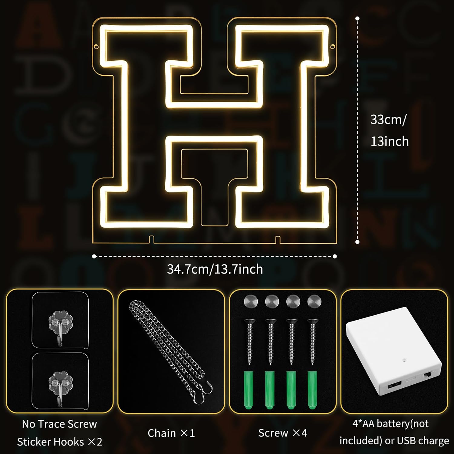 - 13" x 13.7" Letters H Light Up Sign! Whether it’s a birthday bash, wedding, kids' room, home decor, or a special event, this Letter H Neon Sign is the ultimate vibe booster! It’s also the perfect gift for Valentine’s Day, Christmas, or any occasion—your loved ones will adore it!