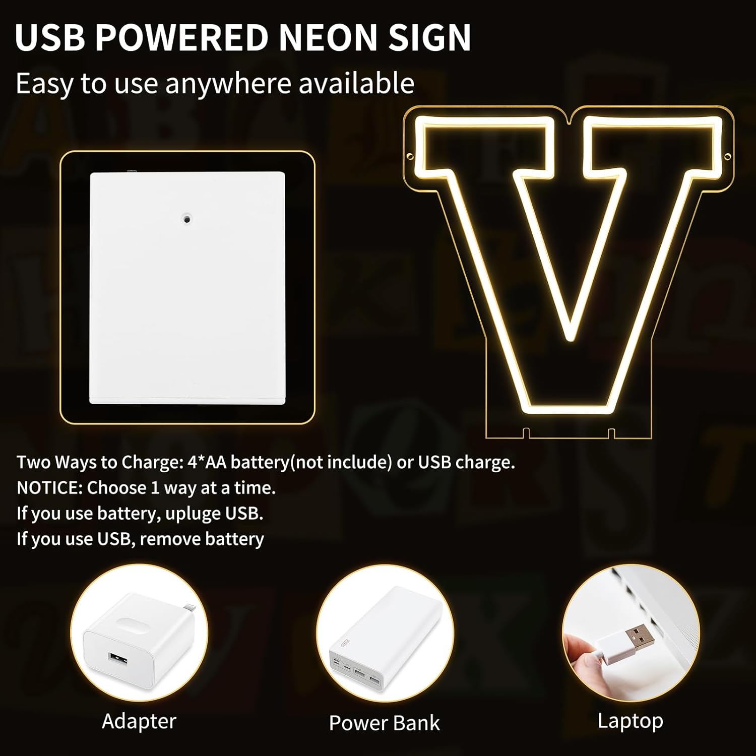 - 13.7" x 13" Letters V Light Up Sign! Whether it’s a birthday bash, wedding, kids' room, home decor, or a special event, this Letter V Neon Sign is the ultimate vibe booster! It’s also the perfect gift for Valentine’s Day, Christmas, or any occasion—your loved ones will adore it!