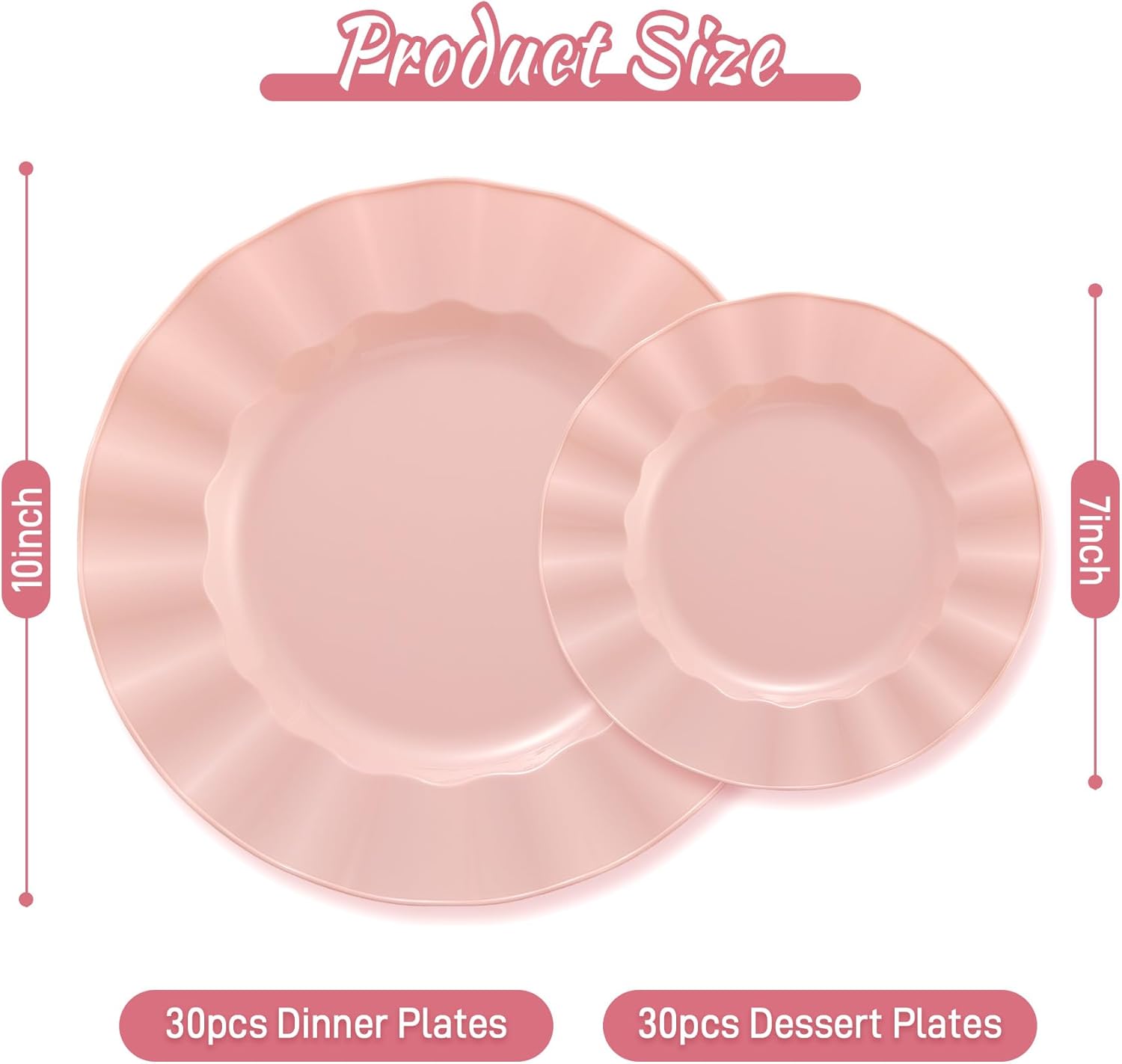 - Complete Party Set : The 60pcs fancy disposable dinnerware set include 30 10"pink dinner plates and 30 7" dessert plates. Whether you're hosting a small gathering or a grand celebration, these pink disposable plates stack neatly for compact storage and bring effortless style and practicality to your table.