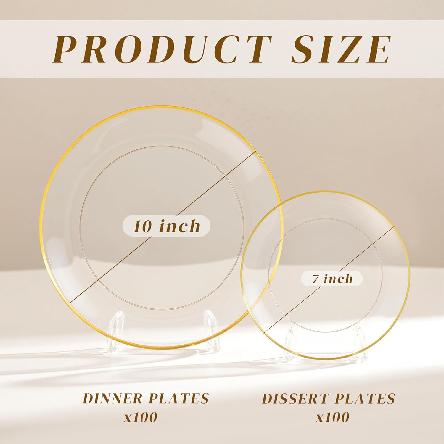 bUCLA 200PCS Clear and Gold Plastic Plates - Clear Disposable Plates with Gold Rim, Includes 100 PCS 10 inch Dinner Plates and 100 PCS 7 inch Dessert Plates for Party&Wedding
