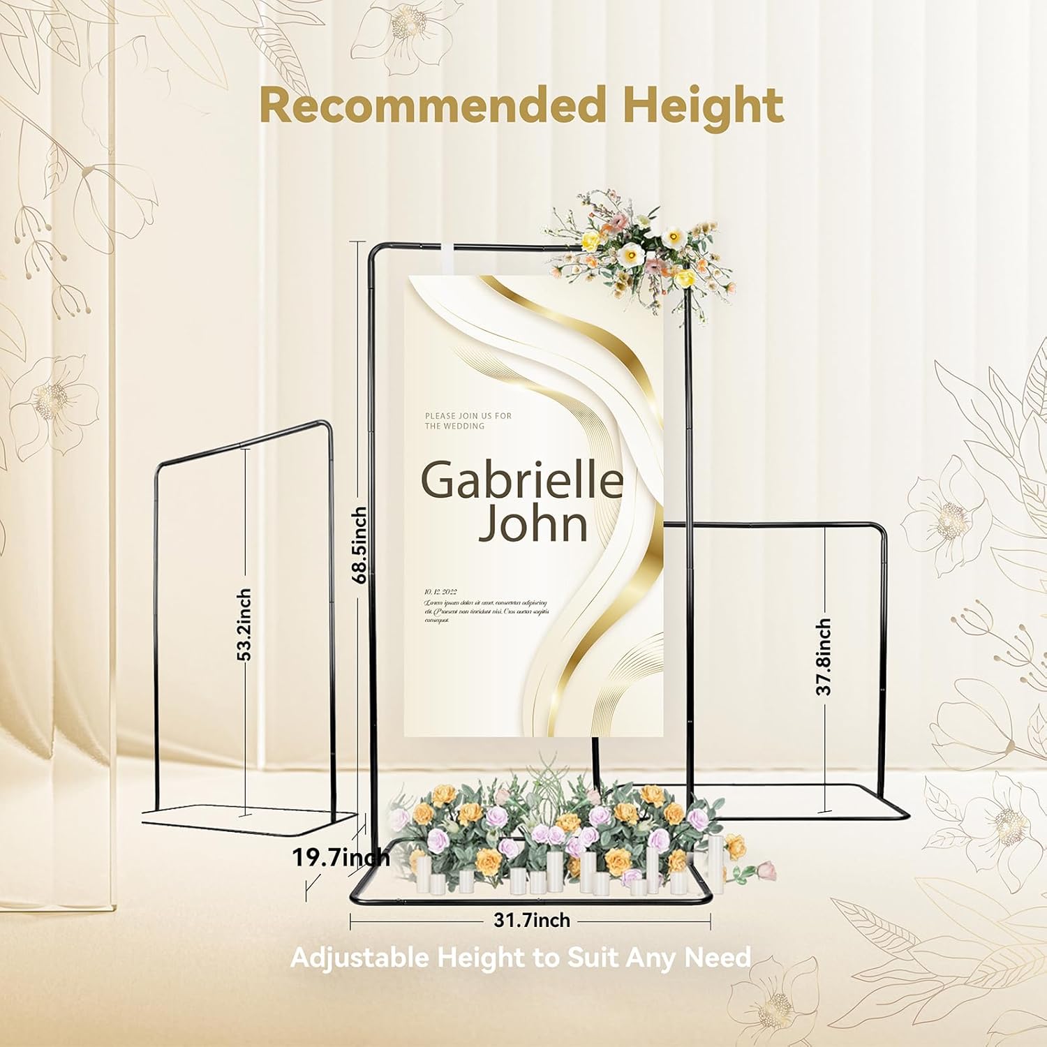 - Adjustable Height: 3 recommended available height (68.5"/53.2"/37.8"). The metal easel stand for sign features a 31.7" wide base, designed to stably support a large sign, poster, seating chart and similar displays & while maintaining refined visual elegance