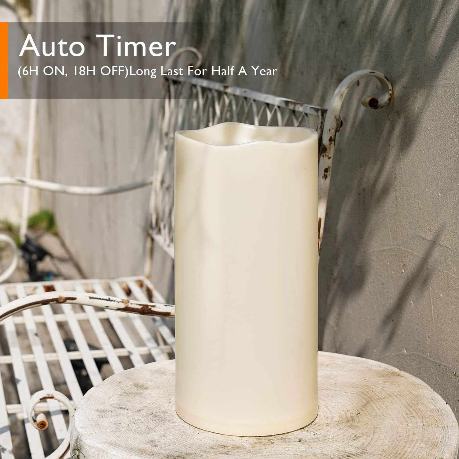 - Easy to Use: The switch on the bottom allows you to turn the outdoor waterproof candles ON / OFF. When candle turned ON, default 6-hour timer works(NO REMOTE), which will save trouble to turn candle on/off because they will come back on automatically at the same time every day.