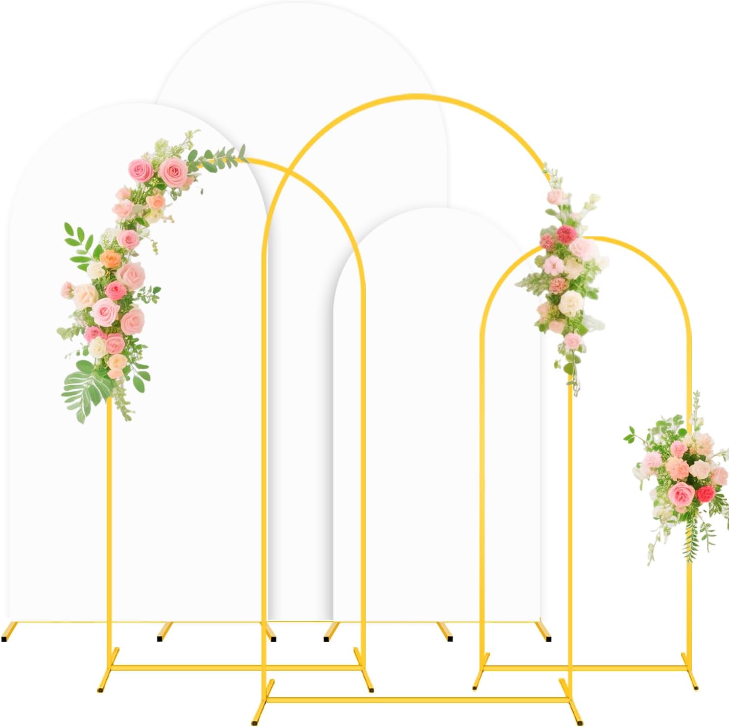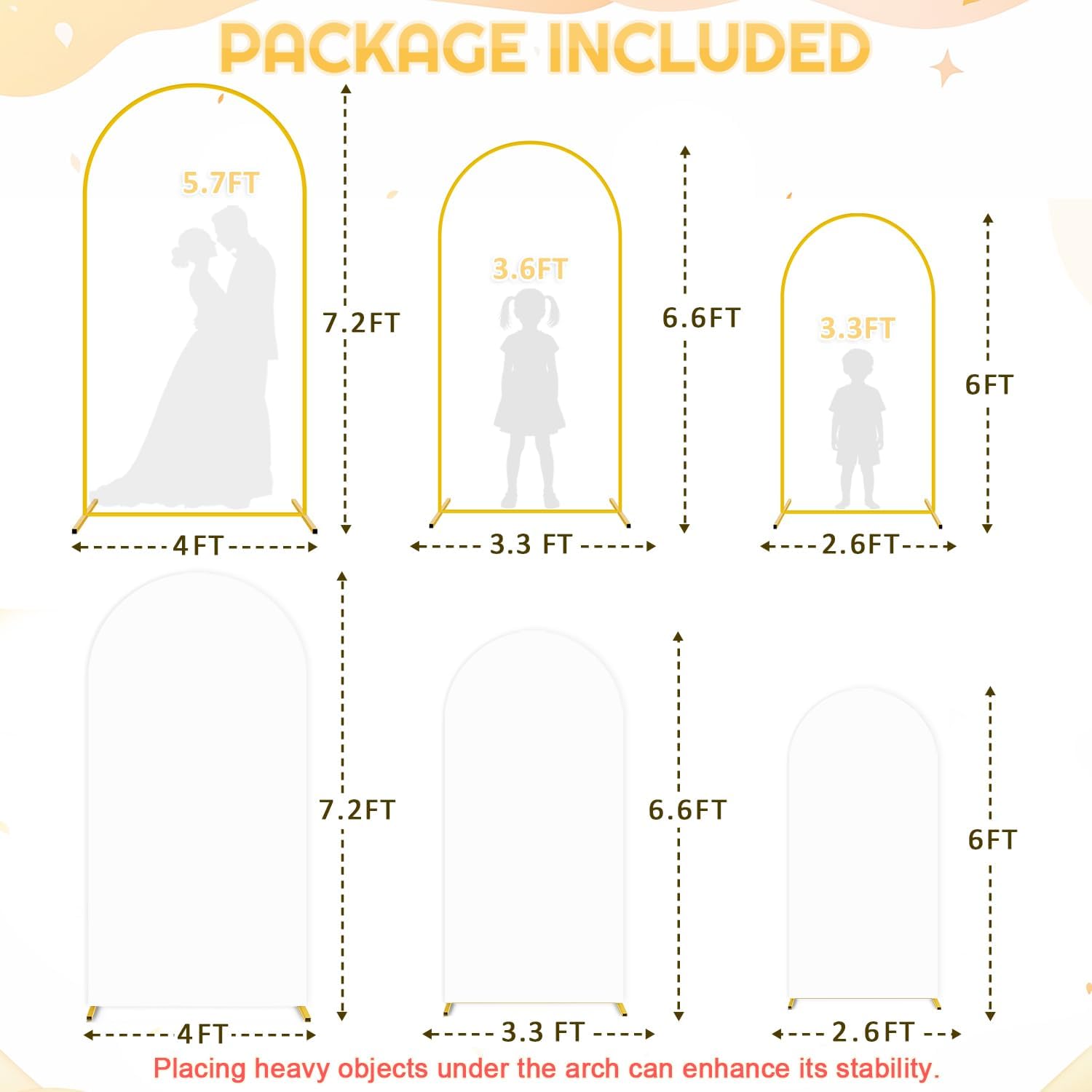 - 🥂【Package Included - Arch Backdrop Stand and Cover Set】You will receive 3 gold arch backdrop stand and 3 white arch cover backdrop fabric. Size: Size: 7.2ft H x 4ft W, 6.6ft H x 3.3ft W, 6ft H x 2.6ft W. Let's create unforgettable moments with our arched backdrop cover!