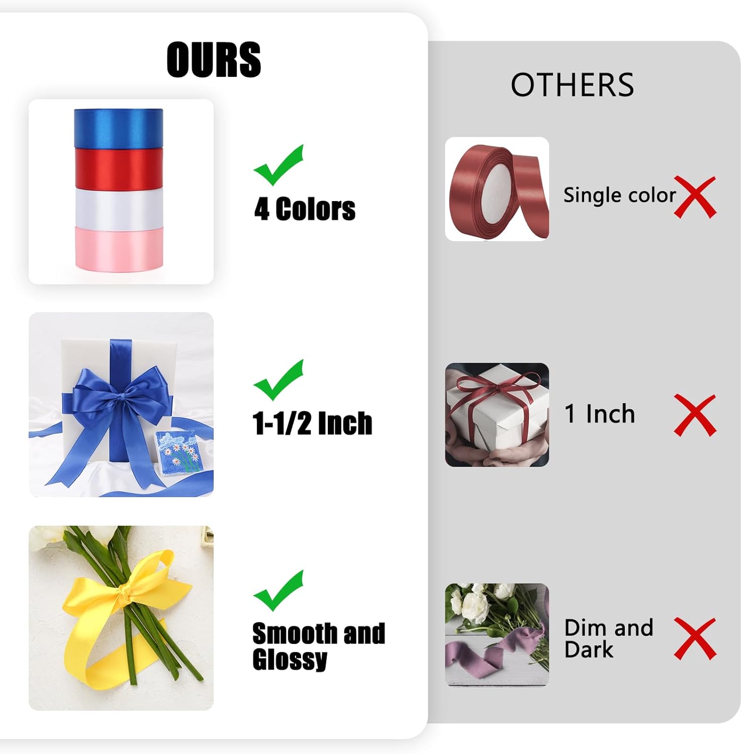 - π Perfect Size: Each roll of ribbon is 1-1/2 inches (4cm) wide, 25 yards (23m) long,Total of 4 rolls,making it easy to cut, fold, twist, or tie into any shape and design you want. It can also be ironed or steamed to remove wrinkles or creases,so that you can reuse it. Enough to meet your different decoration needs.