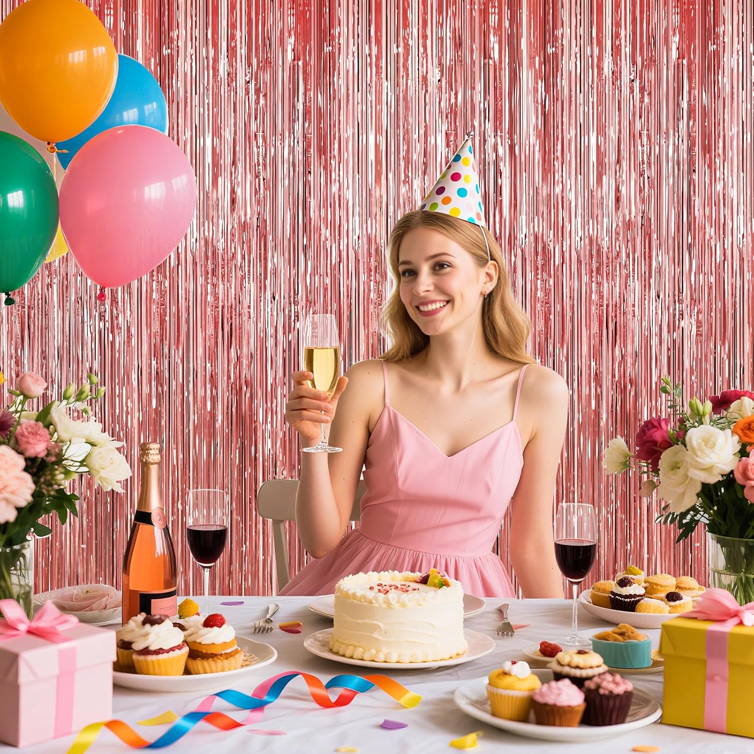 Rose Gold Tinsel Backdrop Birthday Decorations, 2Pack Foil Curtains Metallic Photo Backdrop Foil Fringe Curtains, Party Streamers Supplies for Wedding Xmas Graduation Bachelorette Disco Door Decors