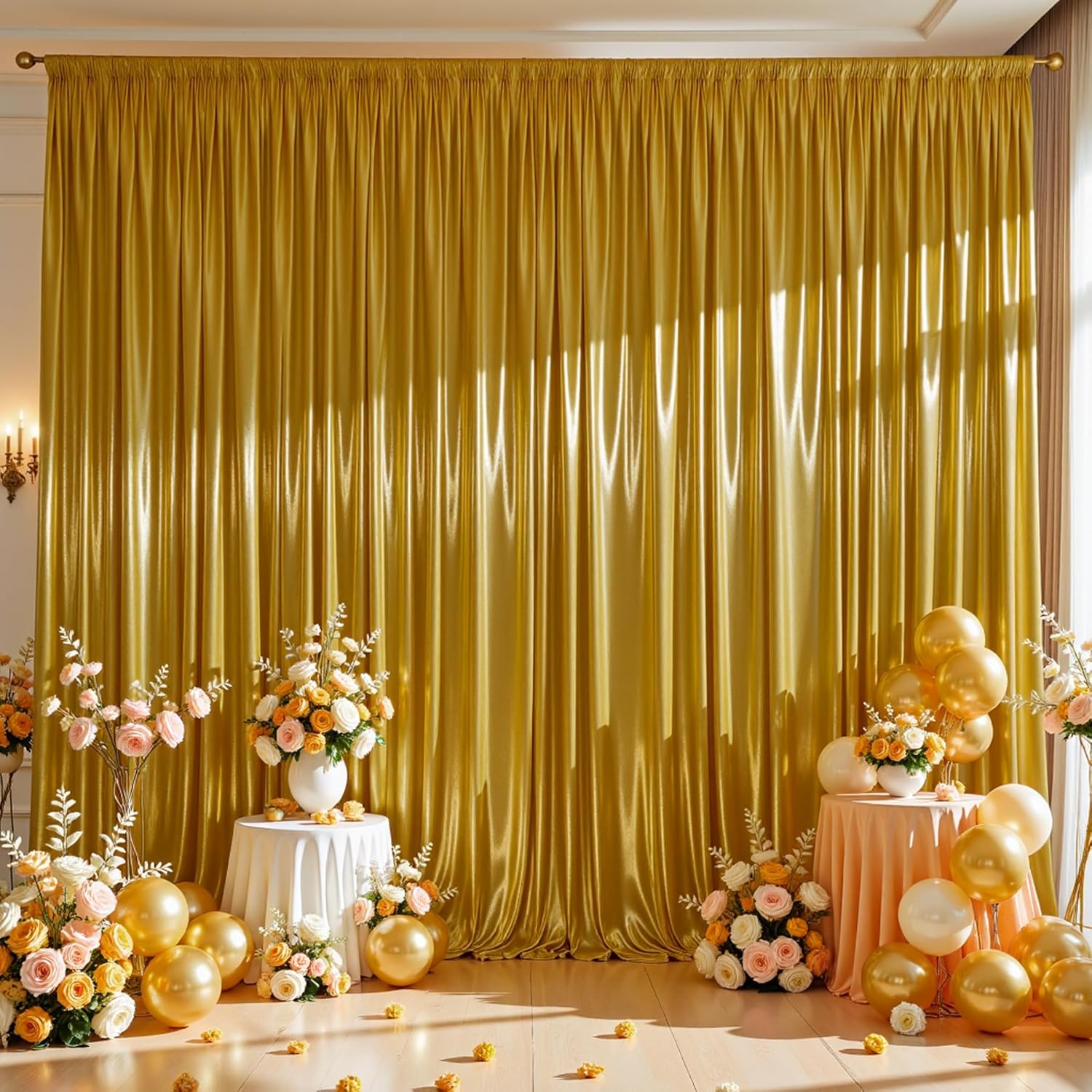 - Sparkly Gold Drapes Versatile Usability: Bring a joyous atmosphere to your party, eye-catching background choice for baby showers, weddings, receptions, bridal showers,weddings, birthday celebrations, festive gatherings, disco-themed photo shoot, last-minute sessions,balloon arch photo backdrop,candy buffets, home events, dessert table backdrops, trade shows, wedding stage photography, photo booths, ceremonies and more