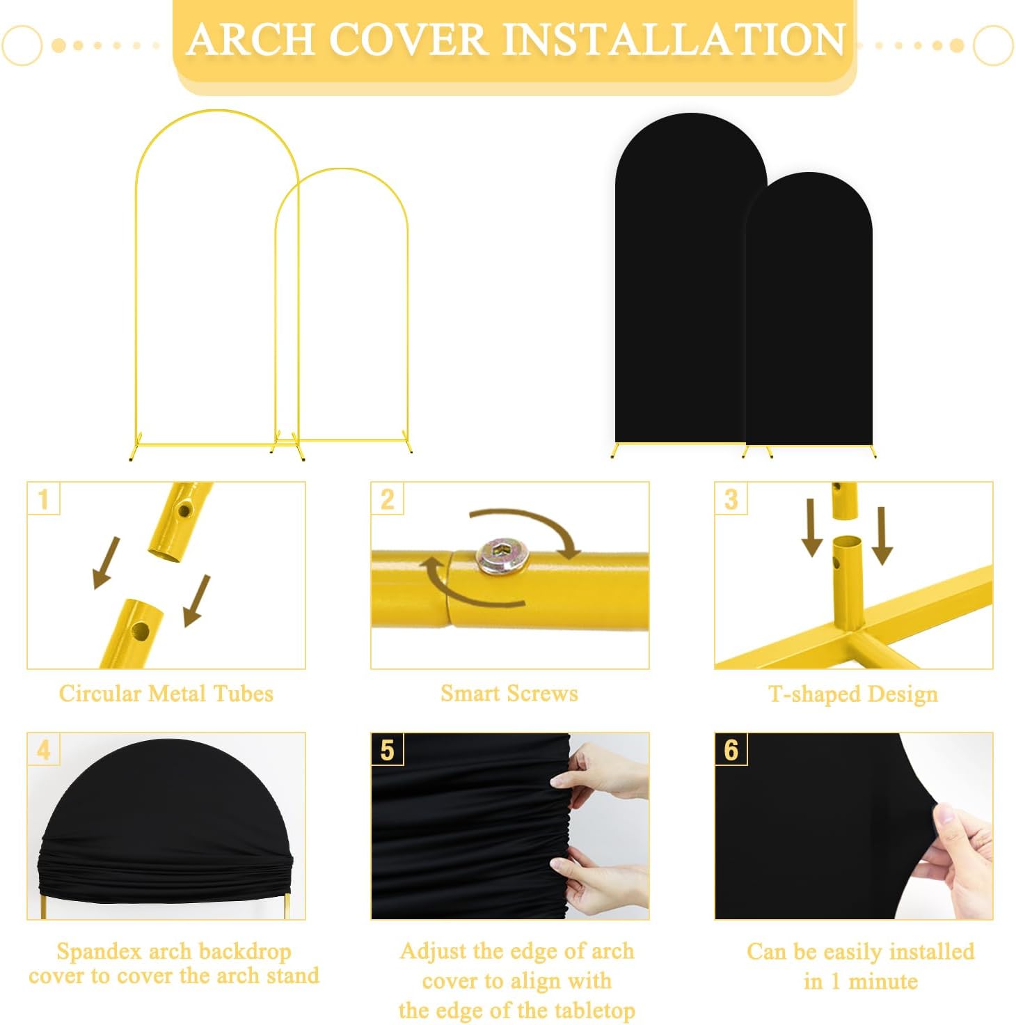 Wedding Arch Backdrop Stand and Cover Set of 2 6FT 7.2FT Black Spandex Fitted Stretchy Arch Stand Covers for Gold Metal Stand Round Top Chiara Backdrop Cover for Birthday Party Decorations