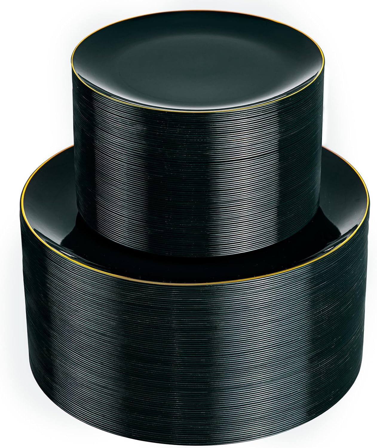 bUCLA 100PCS Green Plastic Plates - Heavy Duty Green Disposable with Gold Rim Include 50 Dinner 10 inch & 50 Dessert 7 inch Plates, Ideal for Party & Christmas